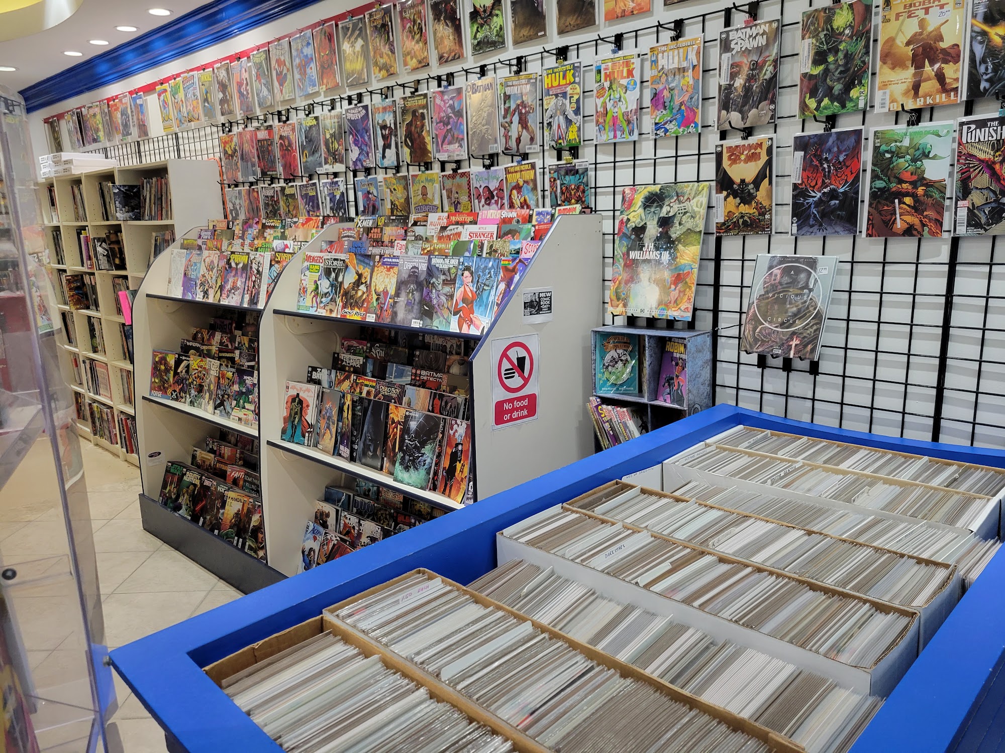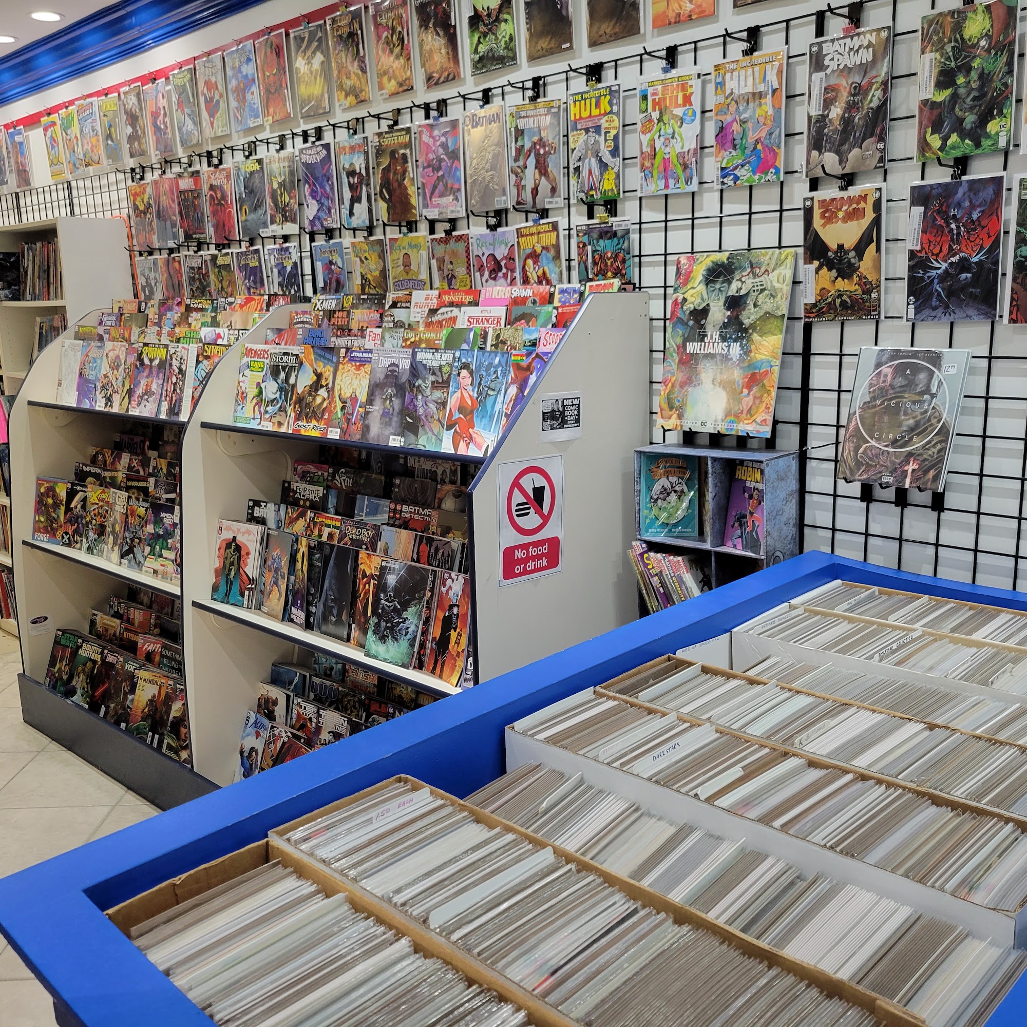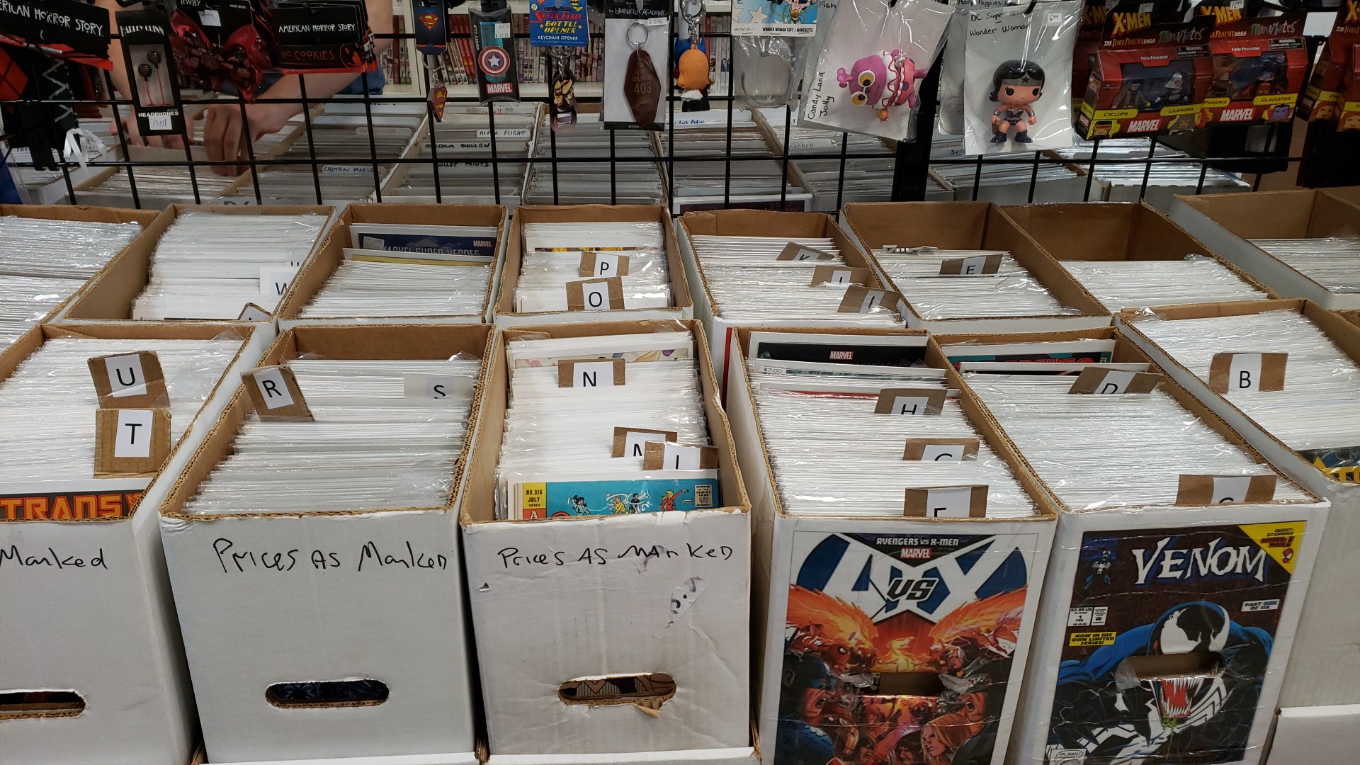 Best store in town to buy comic book supplies. Limited back issue selection, but bins are refreshed regularly. They also put on a free convention in the mall twice a year.