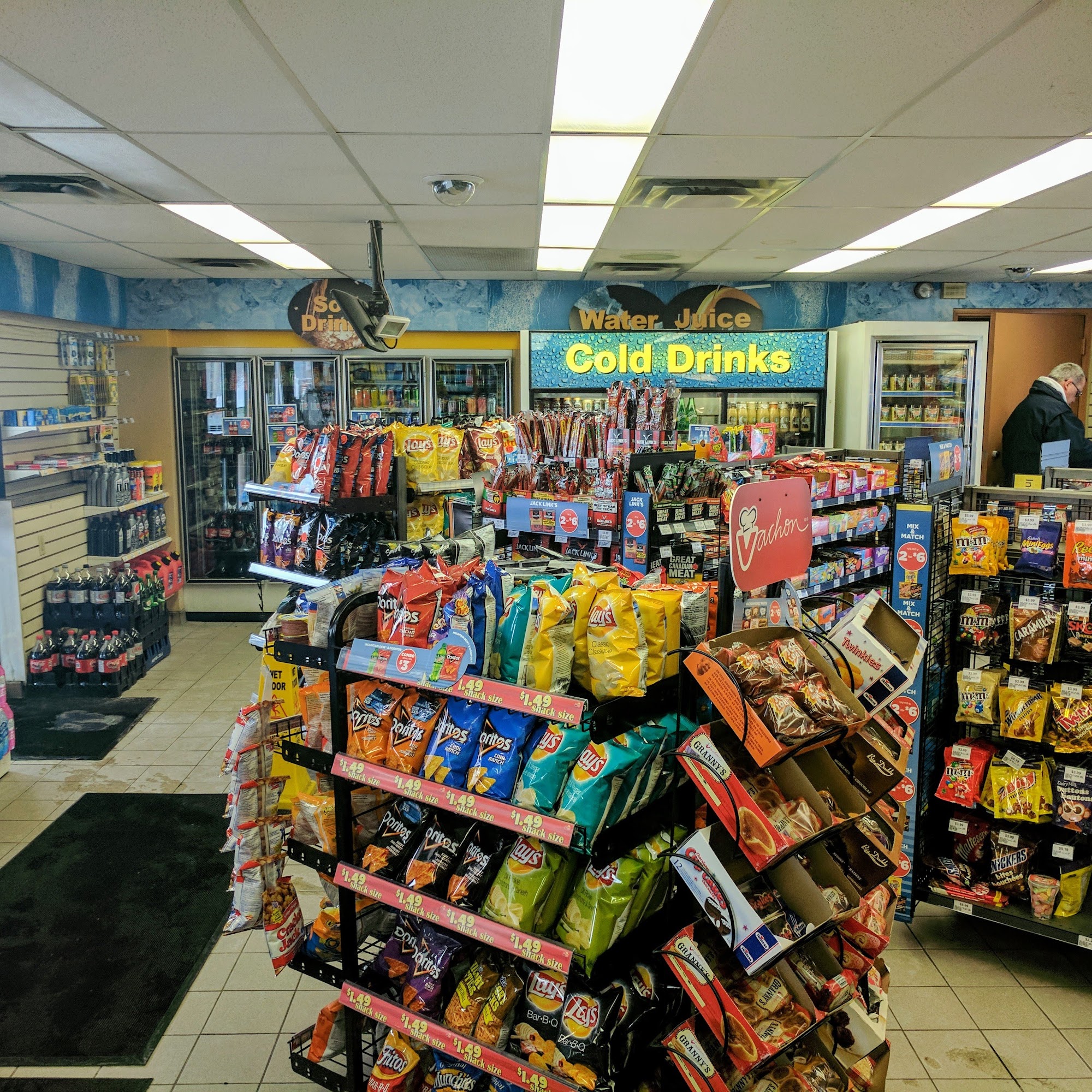 Lifesaver. Man with glasses (?) did not refuse a must needed washroom visit before a doctors office drop in yesterday. Bought water and 2 energy drinks. The best!