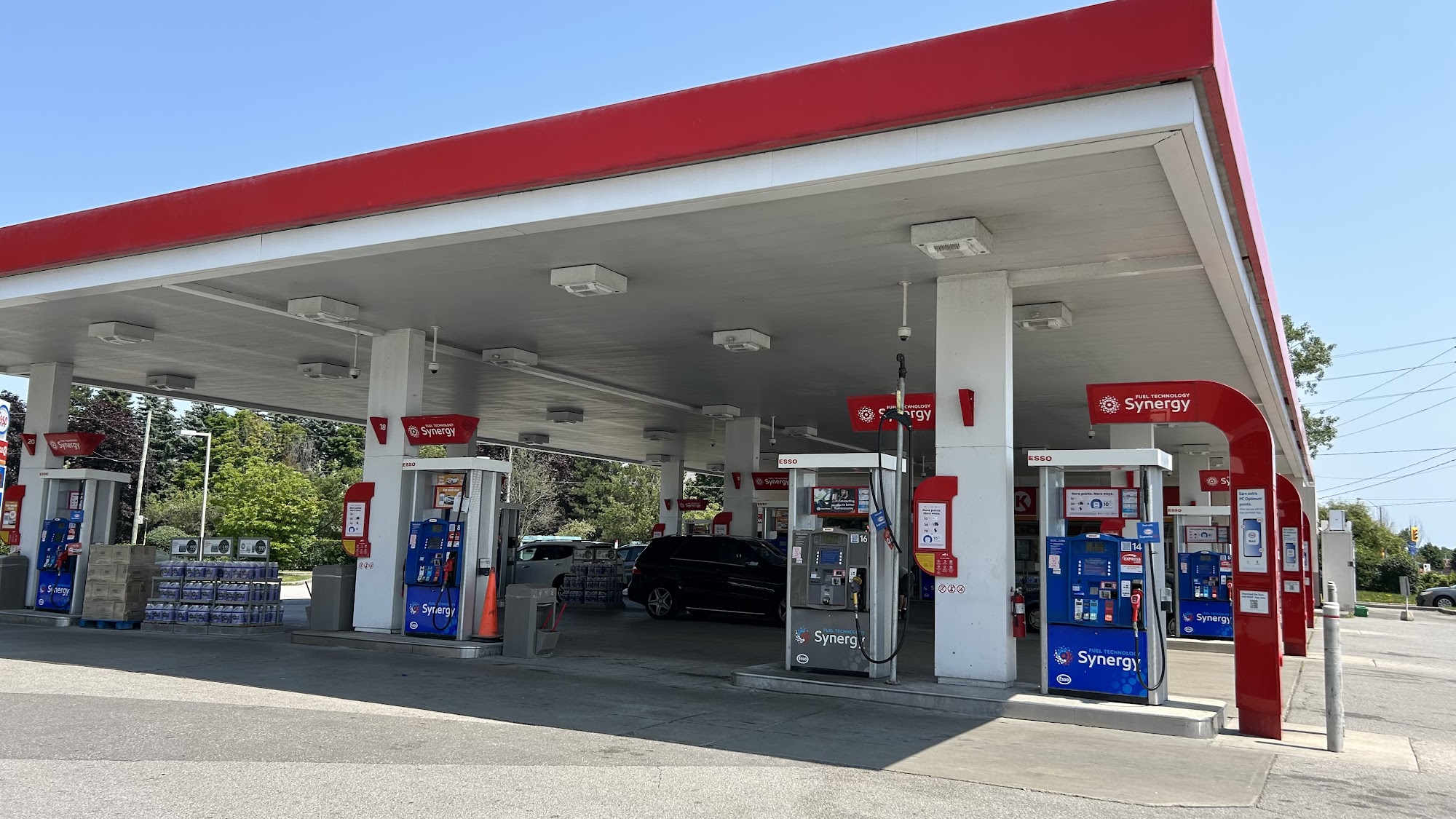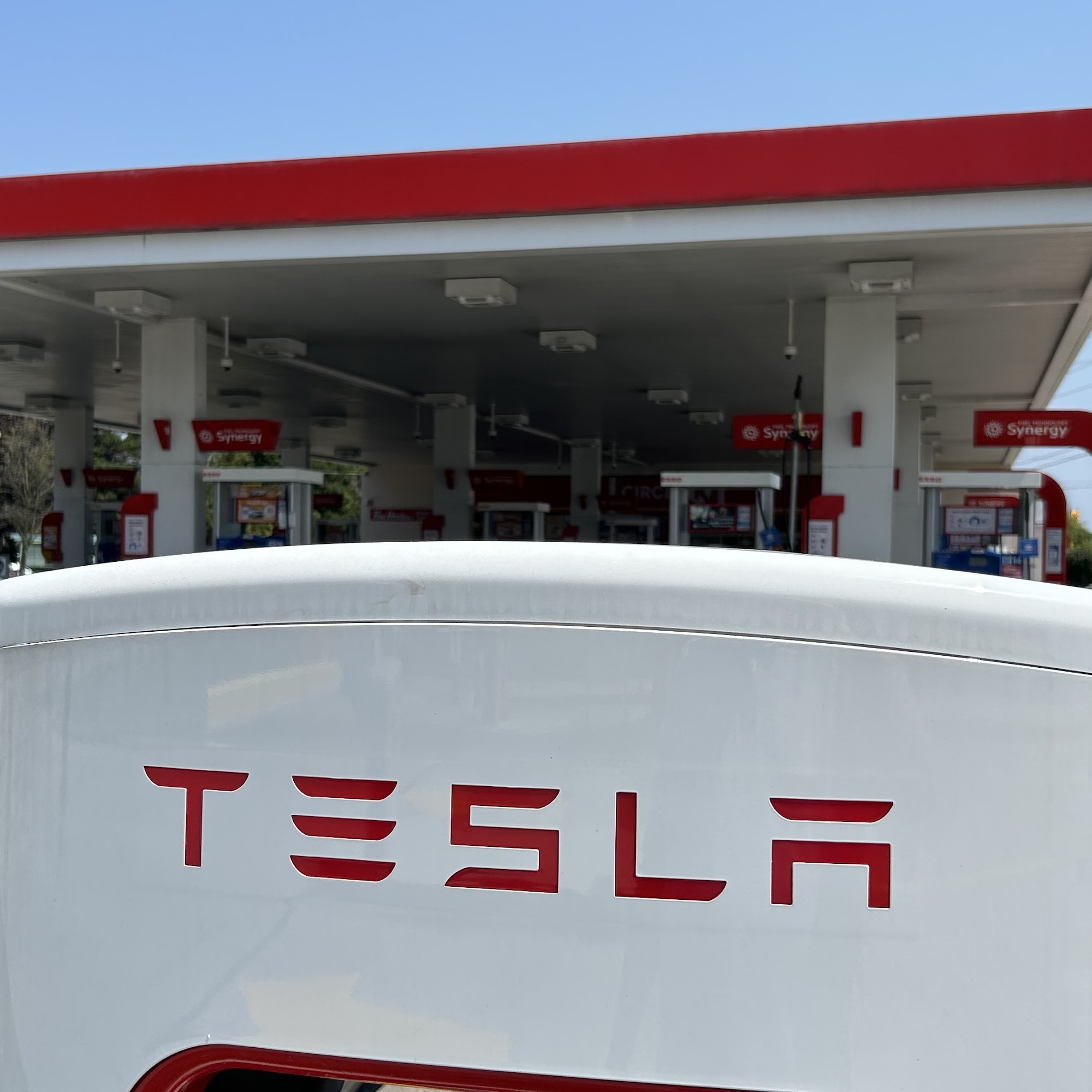 Decent refueling station with Tesla Superchargers, a car wash and varied businesses nearby.