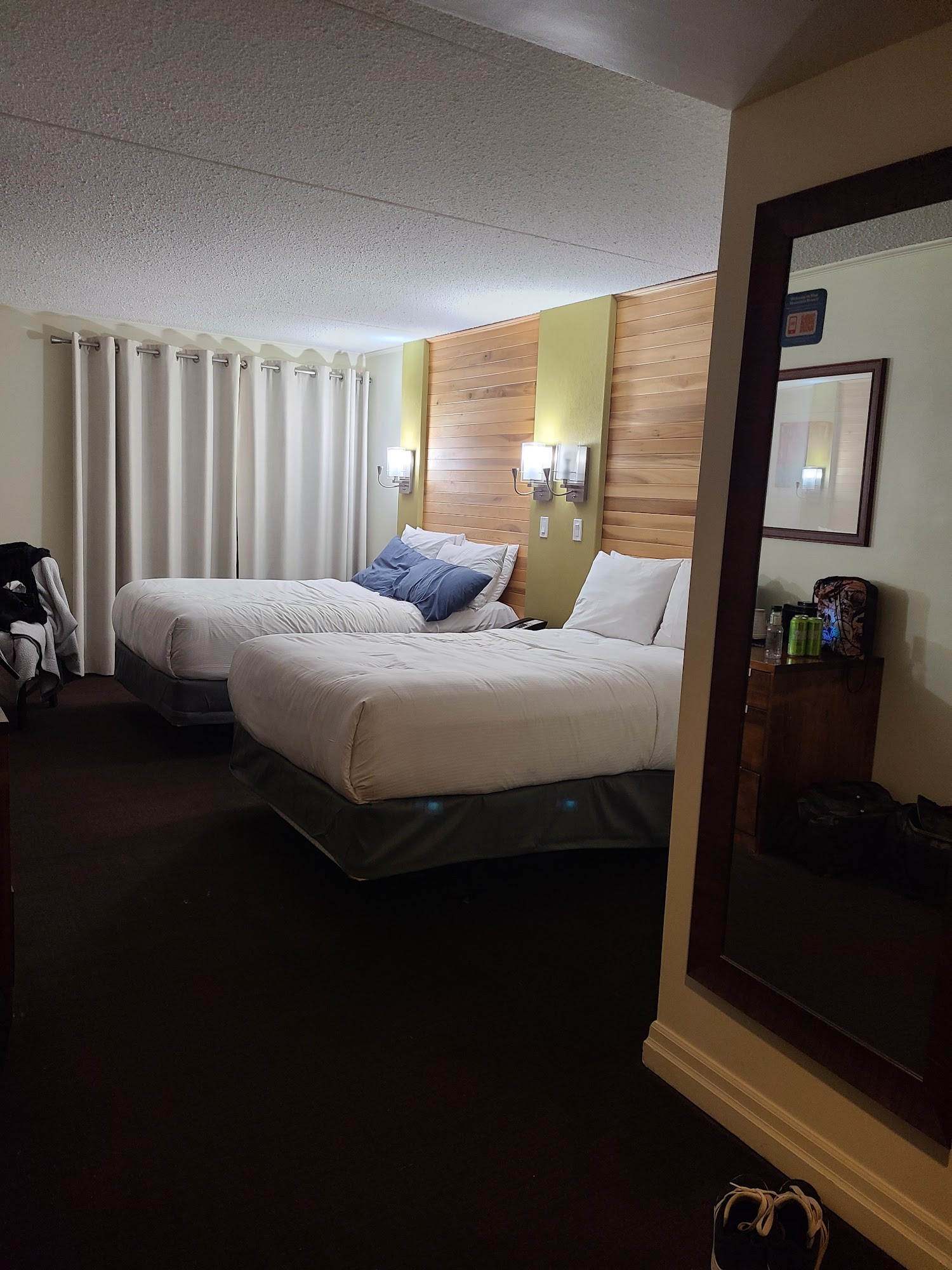Blue Mountain Comp is a hotel that offers a comfortable and convenient stay for visitors to the Blue Mountain area. The hotel boasts an excellent Pottery restaurant, providing delicious food, as well as a newly renovated lobby and five excellent hot tubs. While the carpets in the rooms may need some attention, the linens are very clean, and the hotel provides excellent toiletries and a nice touch with alcohol wipes to clean the remote. The hotel's location is a significant advantage, with the village just a few minutes' walk away. The staff are praised for their excellent hospitality, with special mentions for Bruce, Breanne, and Lauren. Guests appreciate the clean rooms, comfortable beds, and the indoor pool and outdoor hot tubs. However, some note that the bathrooms are small, and the walls are thin, allowing noise from neighboring rooms. Overall, Blue Mountain Comp is a great option for those looking to save money while still being close to the village. The hotel's amenities, such as the pool and hot tubs, and the friendly staff make it a popular choice for visitors to the area, whether visiting for skiing or other activities throughout the year.