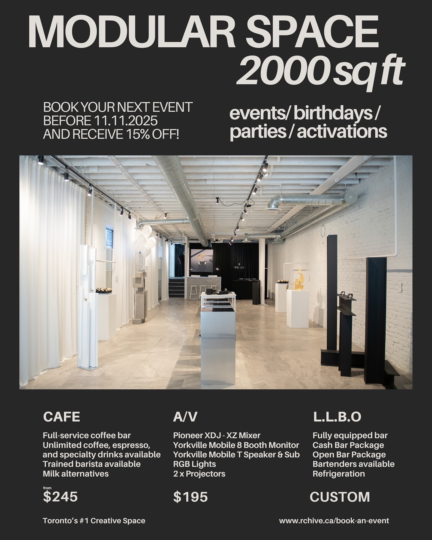 RCHIVE is a creative modular space in the heart of Toronto, designed to host the ideal social and corporate events. Blending contemporary design with artistic flair, RCHIVE offers a versatile environment that adapts seamlessly to any occasion; from brand activations, product launches, and networking mixers to private celebrations and creative showcases. With its customizable layout, in-house amenities, and vibrant community-driven atmosphere, RCHIVE transforms every event into an experience that inspires connection, creativity, and culture.