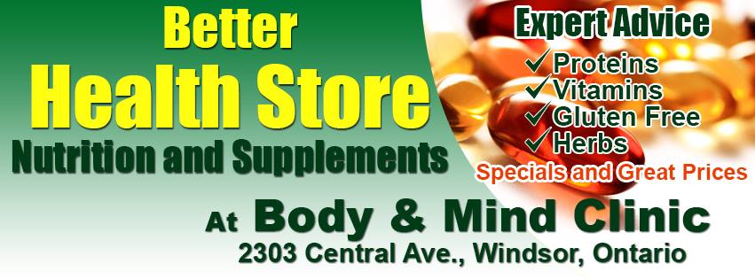 Better Health Store. Family Owned located in Windsor, Ontario. We carry vitamins, minerals, protein, herbs and more. In stock items and special orders available. Visit us today so you can maintain excellent health or work towards achieving it. Many in store specials.