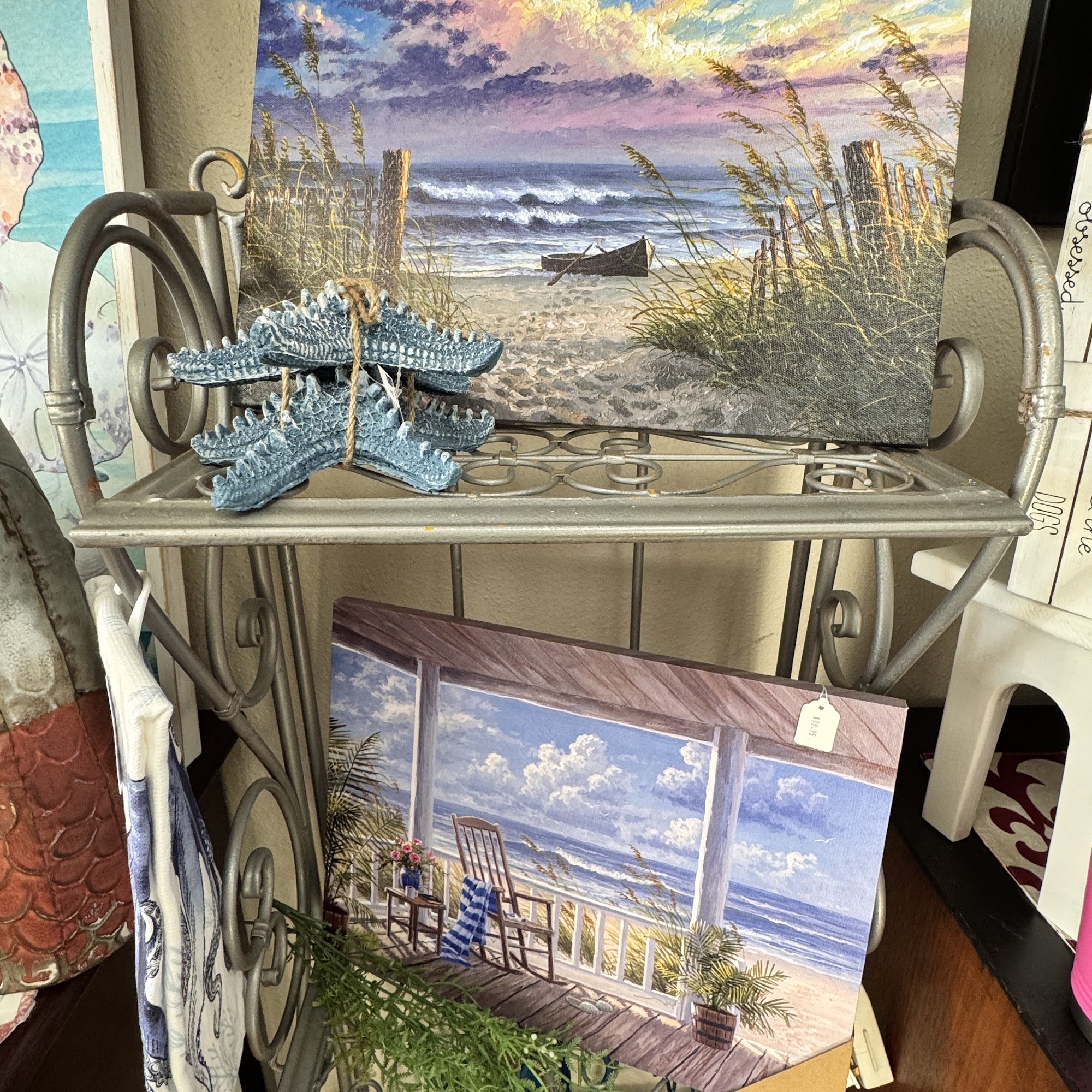 Quality. ocean~themed decorator items. The shop is well organized and has a great shopping atmosphere. There is a small area of clothing and a small room with lots of fun charms and findings to make ocean themed earrings. The staff is helpful. If you have one child who is about 10 years old or + they would love this section.