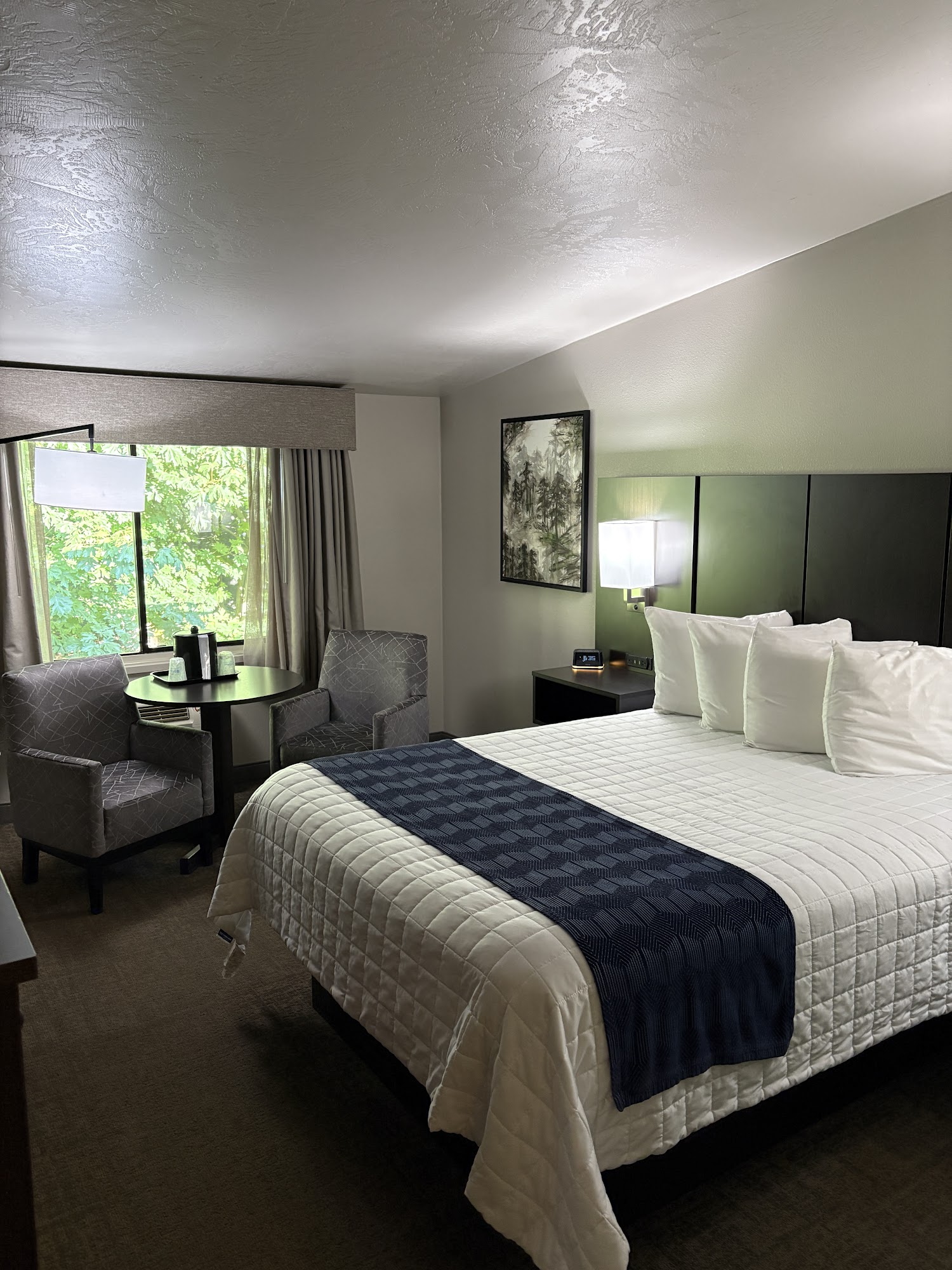 Needed a place to stop on our move to Seattle they had last minute availability with pet friendly rooms. Nice, updated, clean rooms. Check out is 12:00, free hot breakfast, indoor pool and sauna. Right by campus, very cute town.