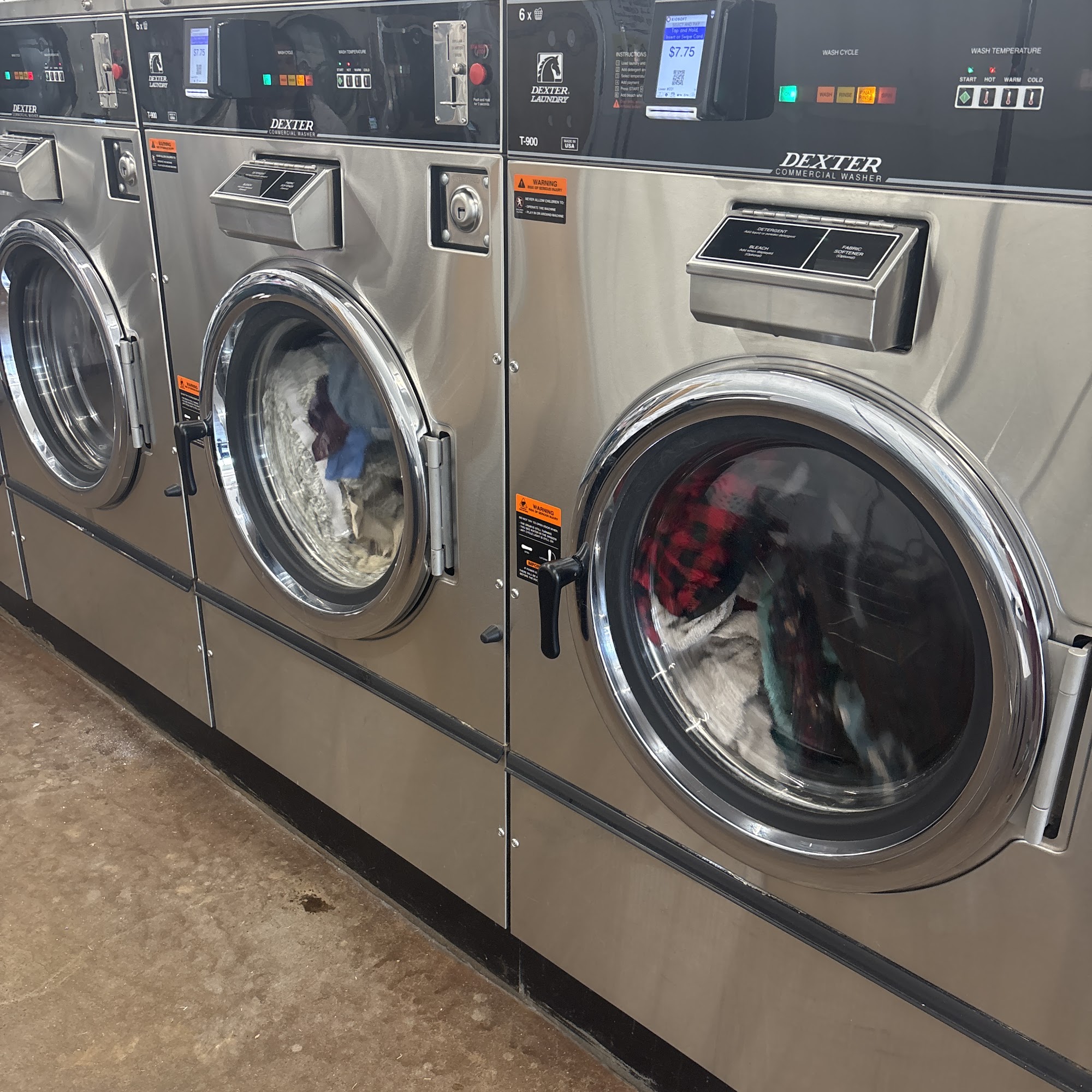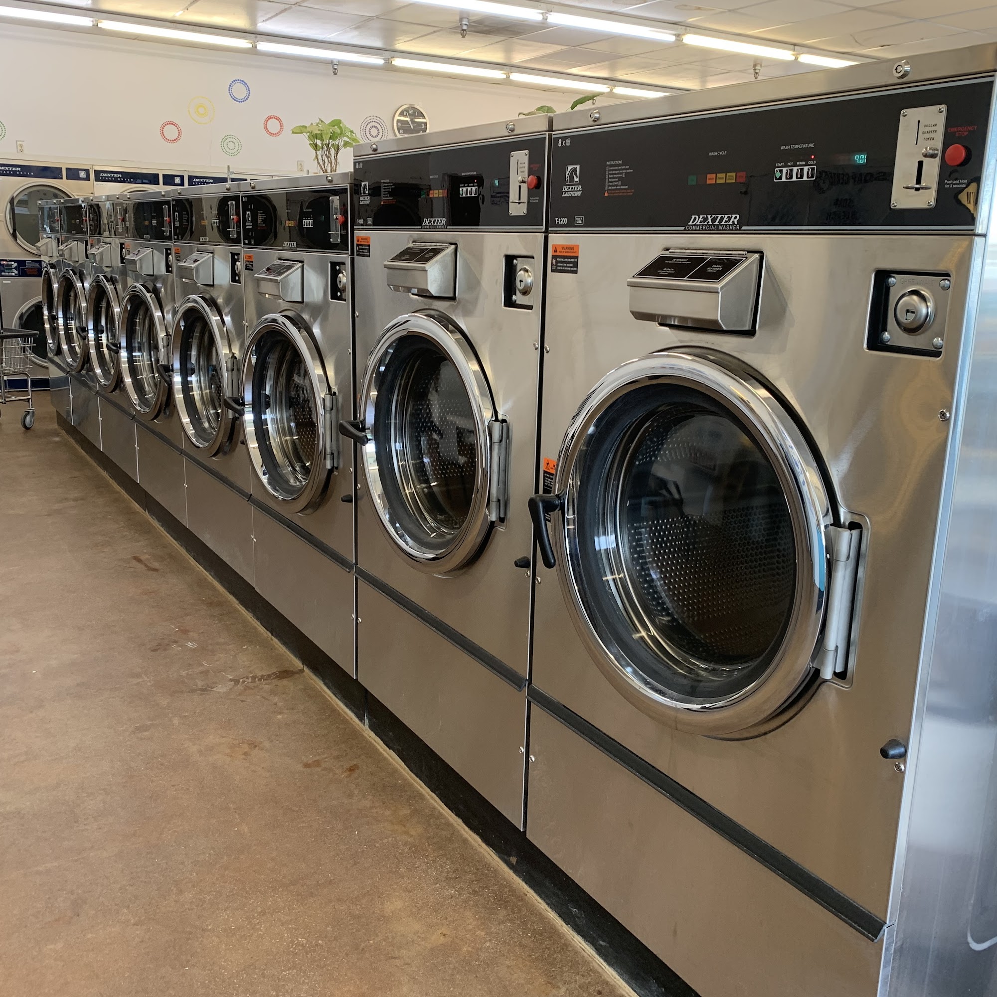 Big, clean, friendly and helpful! Lots of different sizes of machines to choose from.. Lots of comfy seating + TV and machines for snacks and soap as well as a slide for kids and reading material. This is my new spot for sure!