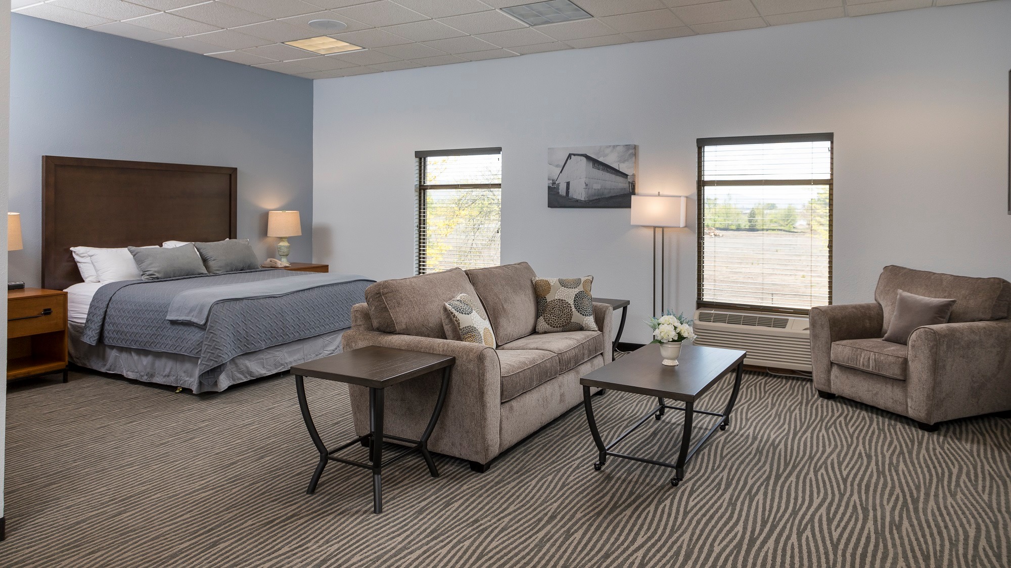 What a great hotel! Very friendly staff. Our room was very nice! Very clean had a kitchen with stove top , microwave and a med size fridge. Love it! All updated