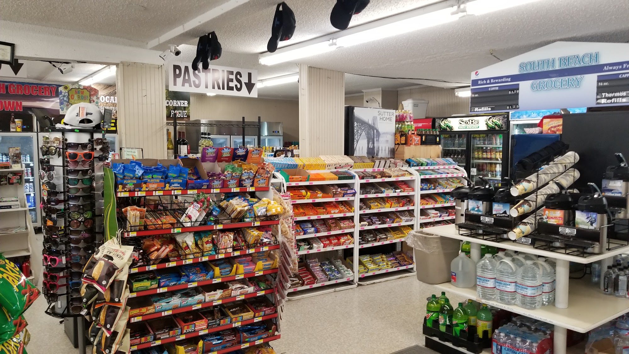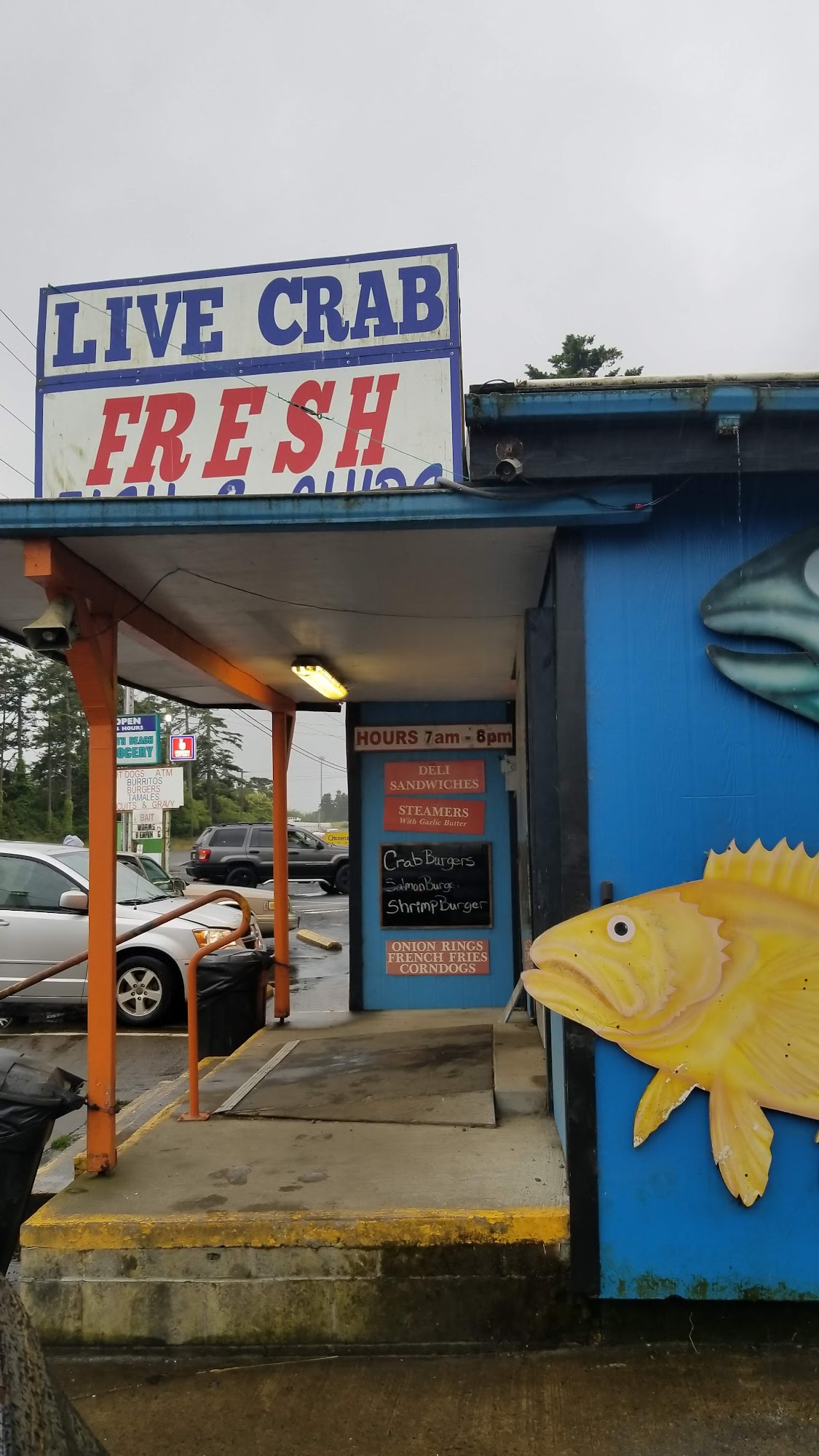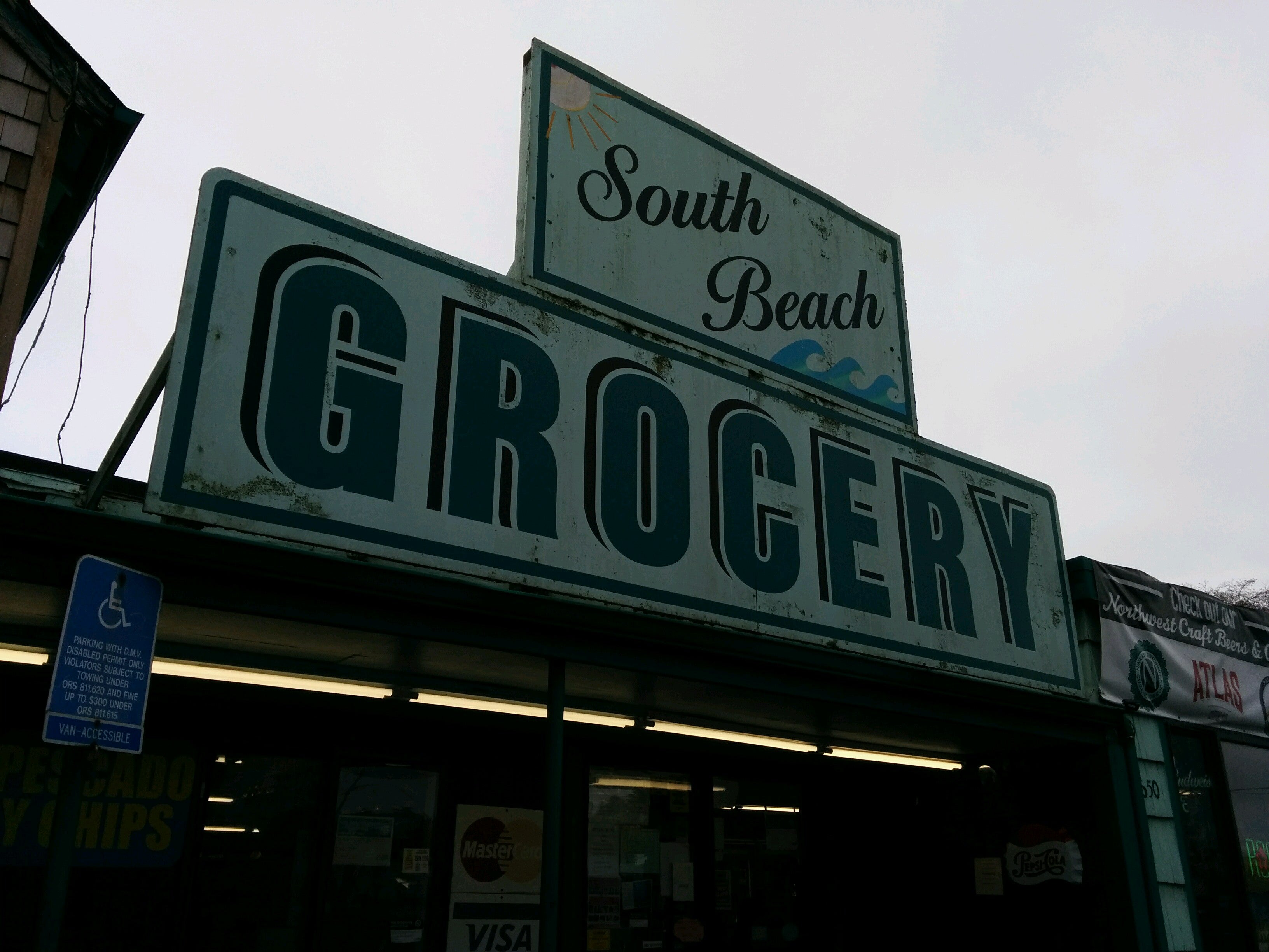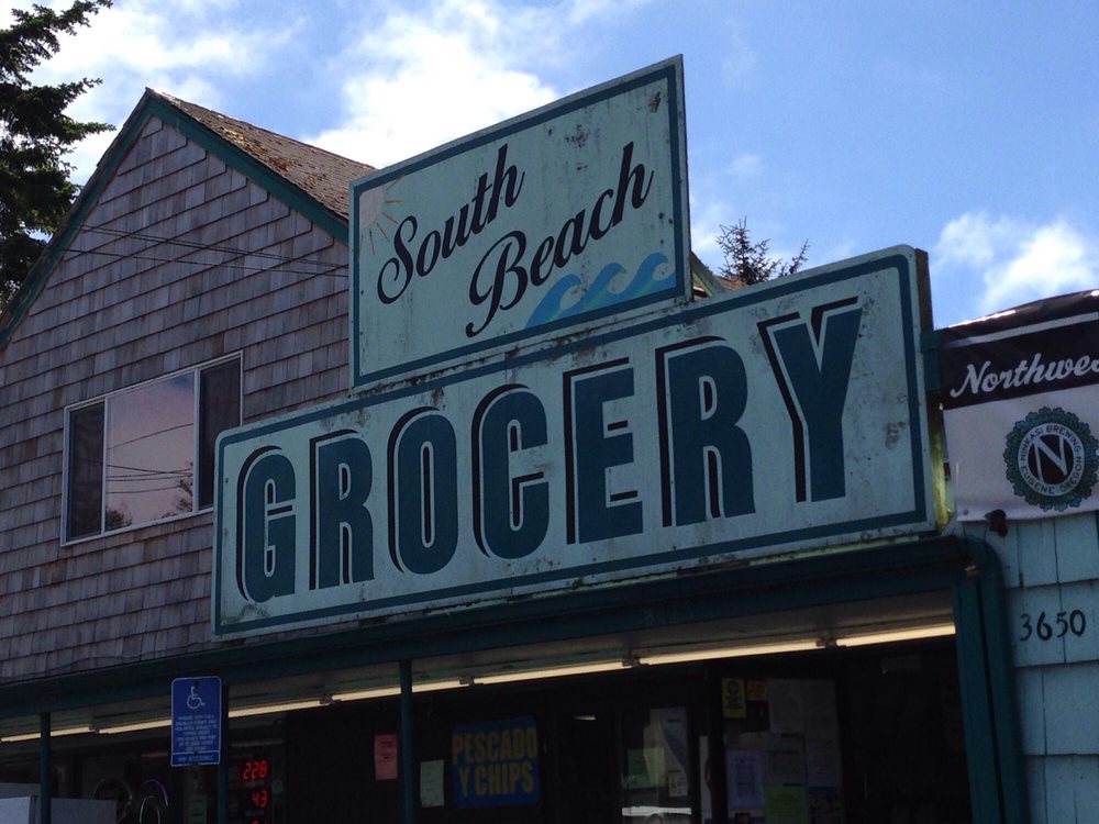 South Beach Grocery is a convenient mini grocery store and rustic roadhouse on the south side of the bridge. It is not very big but is open 24 hours and always clean. The place is old with hand-painted signs, a lot of color, picnic tables, and a gravel parking lot. It is connected to a very popular fish market and casual restaurant that often has a line out the door. The business is well-known for its excellent seafood, especially its fish and chips, which are cooked hot and fresh in front of you. It is not Michelin dining, but it is well-prepared good food that is best eaten outside on a big table. The menu includes items like jumbo prawns and chips, halibut and chips, clam chowder, shrimp and cheese rolls, and cooked Dungeness crab. The staff at the counter and cooking stations are patient, fast, and capable. There is an awesome variety of local beers and ciders, along with snacks, biscuits and gravy, and desserts. It is considered the biggest little country store in the county and a perfect stop on the Oregon coast.
