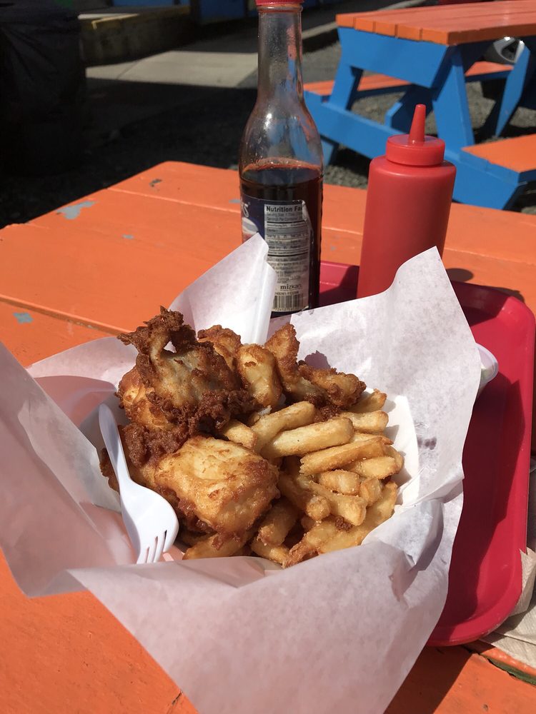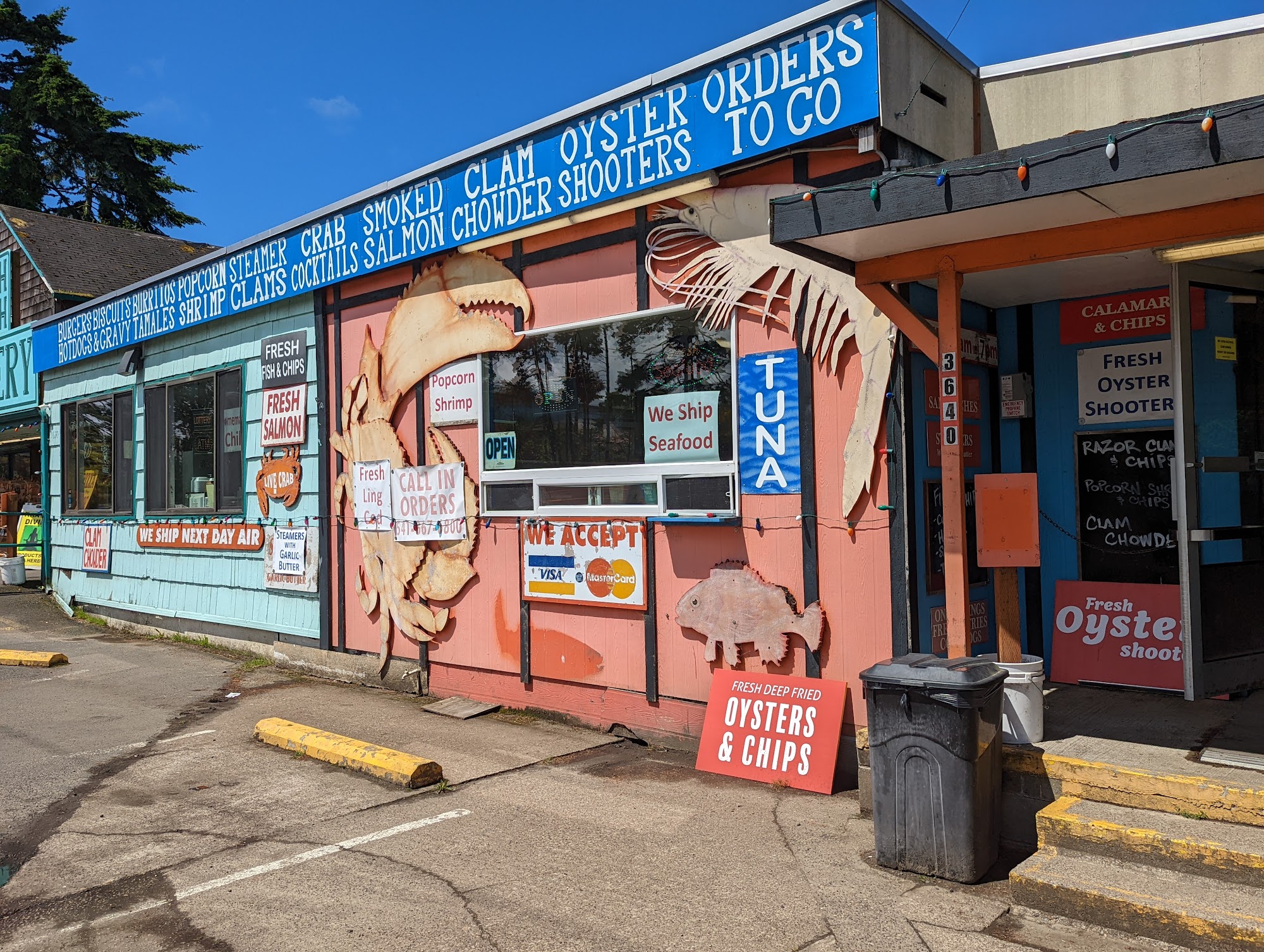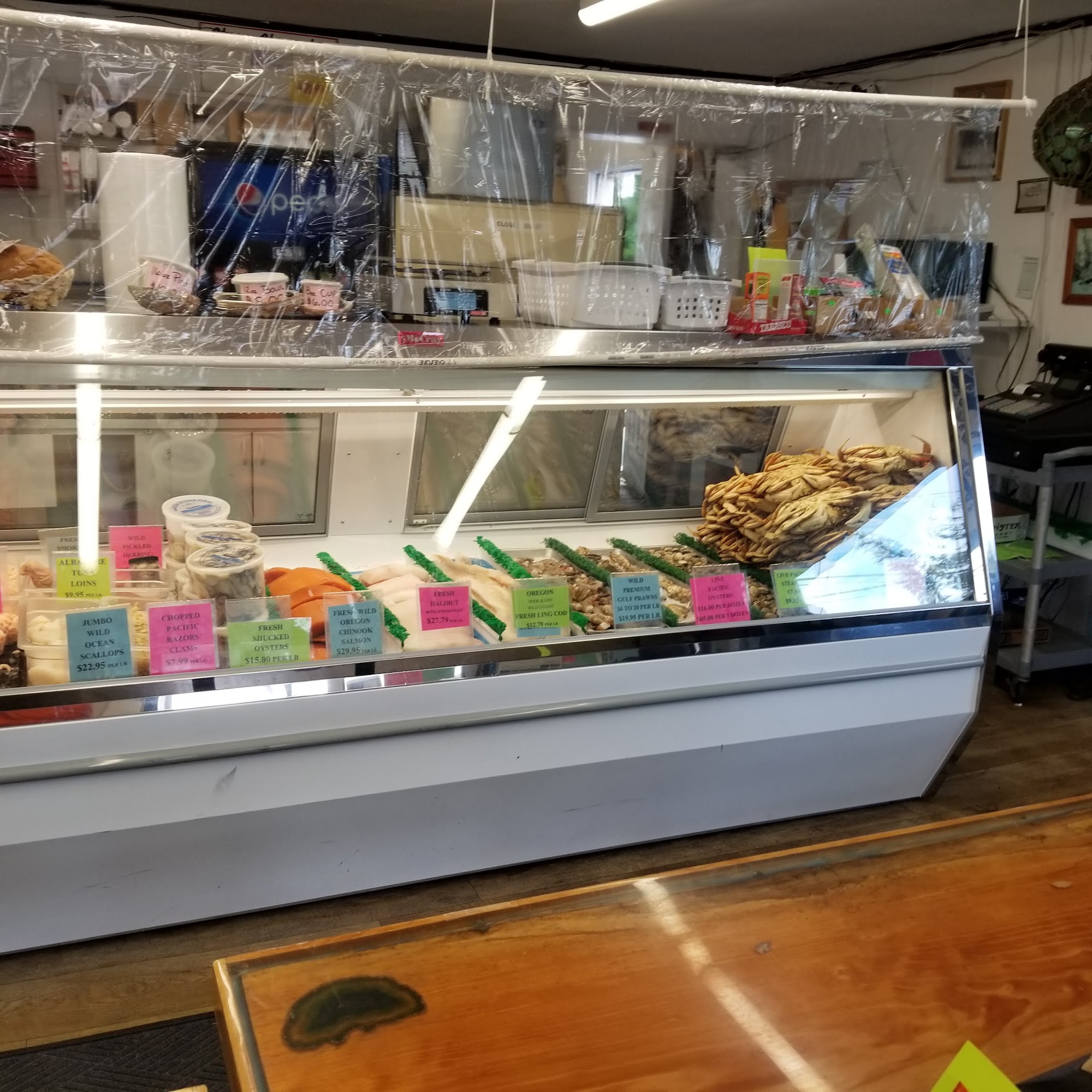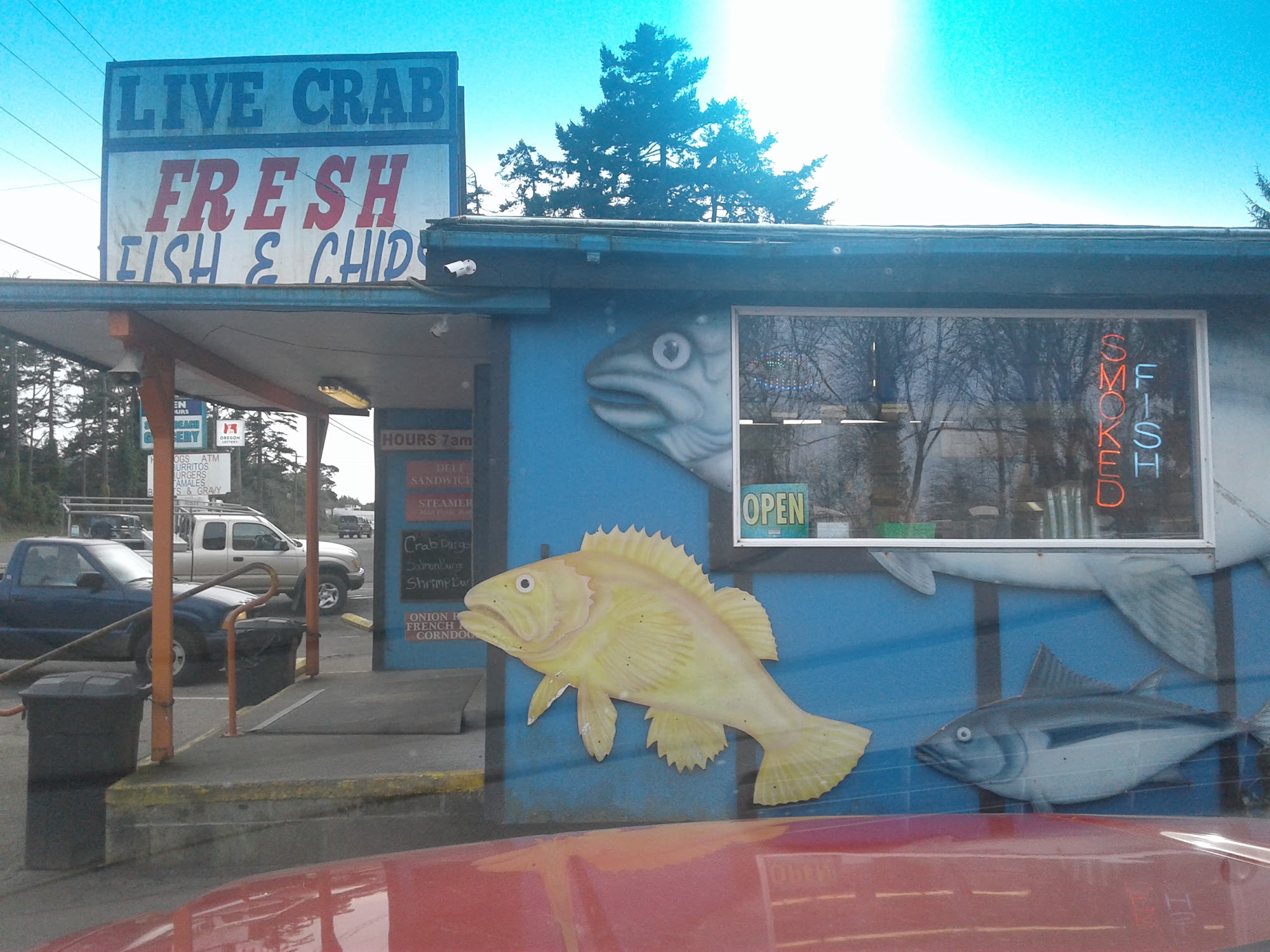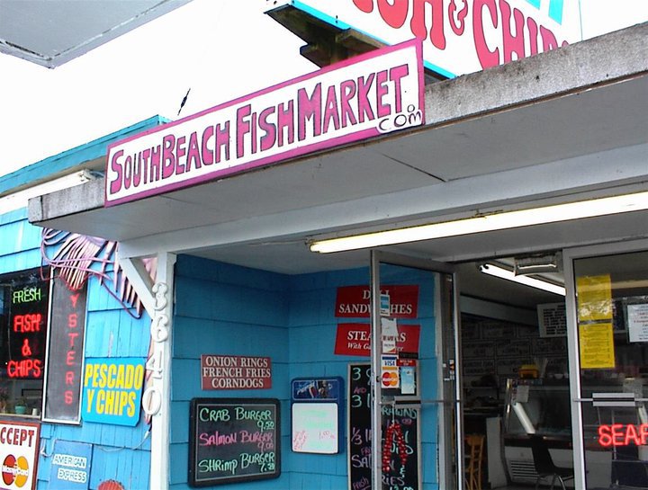 South Beach Grocery is a convenient mini grocery store and rustic roadhouse on the south side of the bridge. It is not very big but is open 24 hours and always clean. The place is old with hand-painted signs, a lot of color, picnic tables, and a gravel parking lot. It is connected to a very popular fish market and casual restaurant that often has a line out the door. The business is well-known for its excellent seafood, especially its fish and chips, which are cooked hot and fresh in front of you. It is not Michelin dining, but it is well-prepared good food that is best eaten outside on a big table. The menu includes items like jumbo prawns and chips, halibut and chips, clam chowder, shrimp and cheese rolls, and cooked Dungeness crab. The staff at the counter and cooking stations are patient, fast, and capable. There is an awesome variety of local beers and ciders, along with snacks, biscuits and gravy, and desserts. It is considered the biggest little country store in the county and a perfect stop on the Oregon coast.