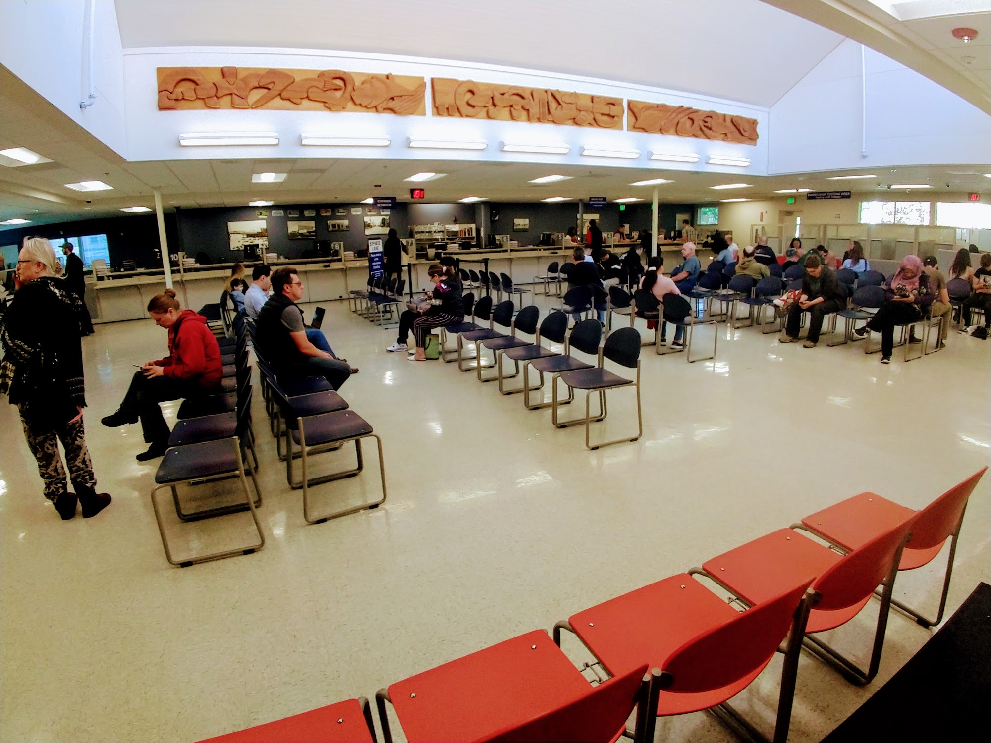 The DMV is Open, and relatively Busy. Wait tines are 10-15 minutes.