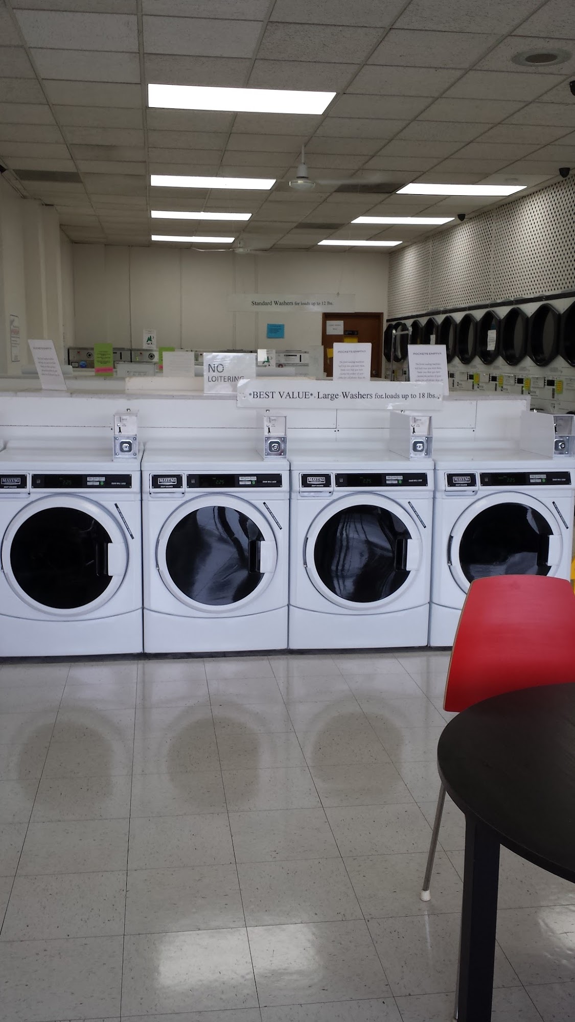 Extremely small washing machines. Do not expect to wash a queen size comforter here. Expensive for the load size. Machines feel cheap. Large dryers though.