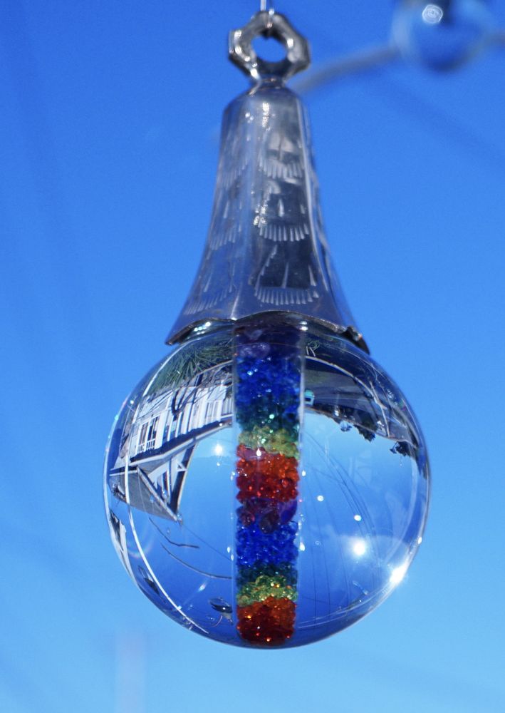 Imagine a large drop of Oregon rain playing with the light as it falls to the ground, reflecting and refracting exquisite images of the natural world. Imagine that same raindrop suspended in space long enough for you to be able to appreciate the beauty of creation reflected inside. That is what is behind James Stephen Du Bois’ creation of Oregon Du Drops, and his nearly fifty-year quest to see what there is to see in a drop of dew. Using the thin glass of recycled and repurposed light bulbs to contain the moisture, Du Bois introduces rain from his Oregon Rain Cellar (est. 1999) into the bulbs and tops the finished Oregon Du Drops with brass temple bells forged in India.