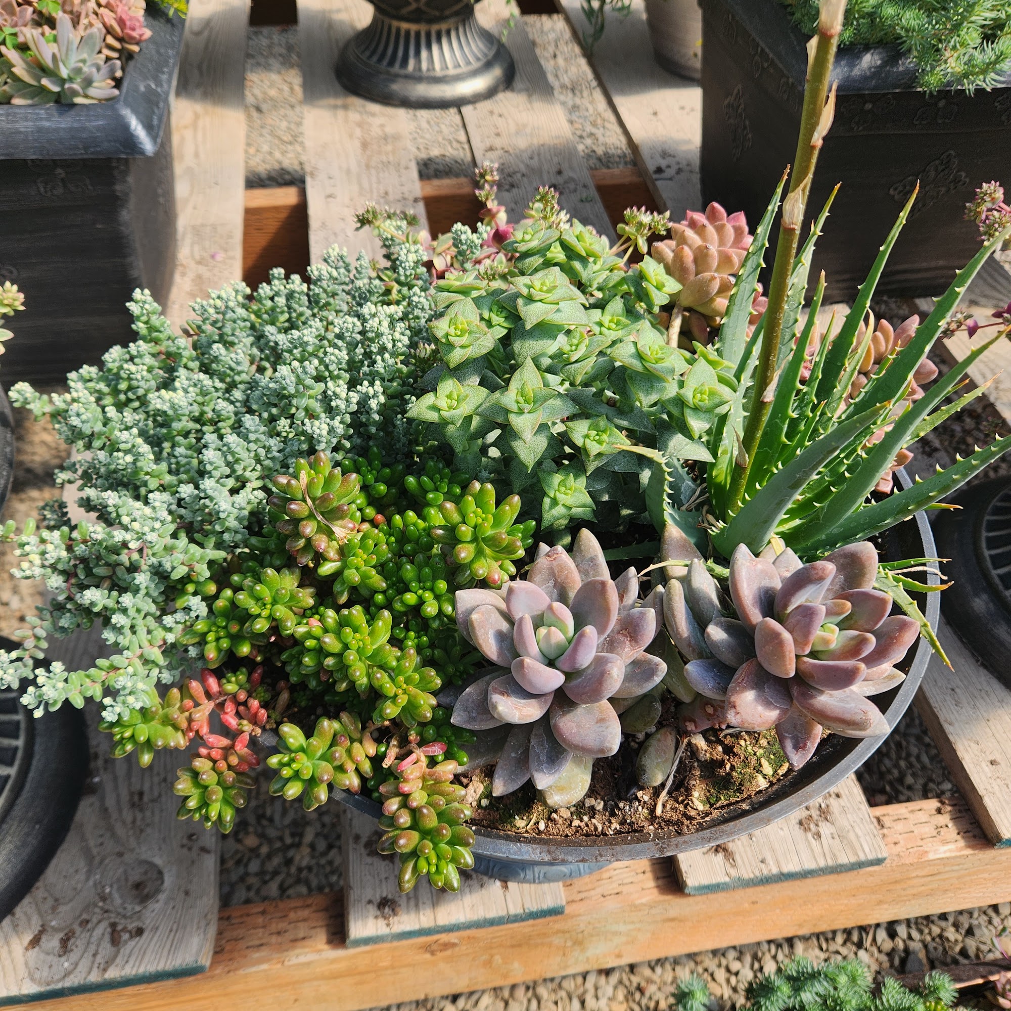 There are hundreds of perennials, annuals, succulents, hanging baskets, and beautiful containers, including shade lovers. There are some tomatoes, peppers, and eggplants along with a large assortment of herbs.