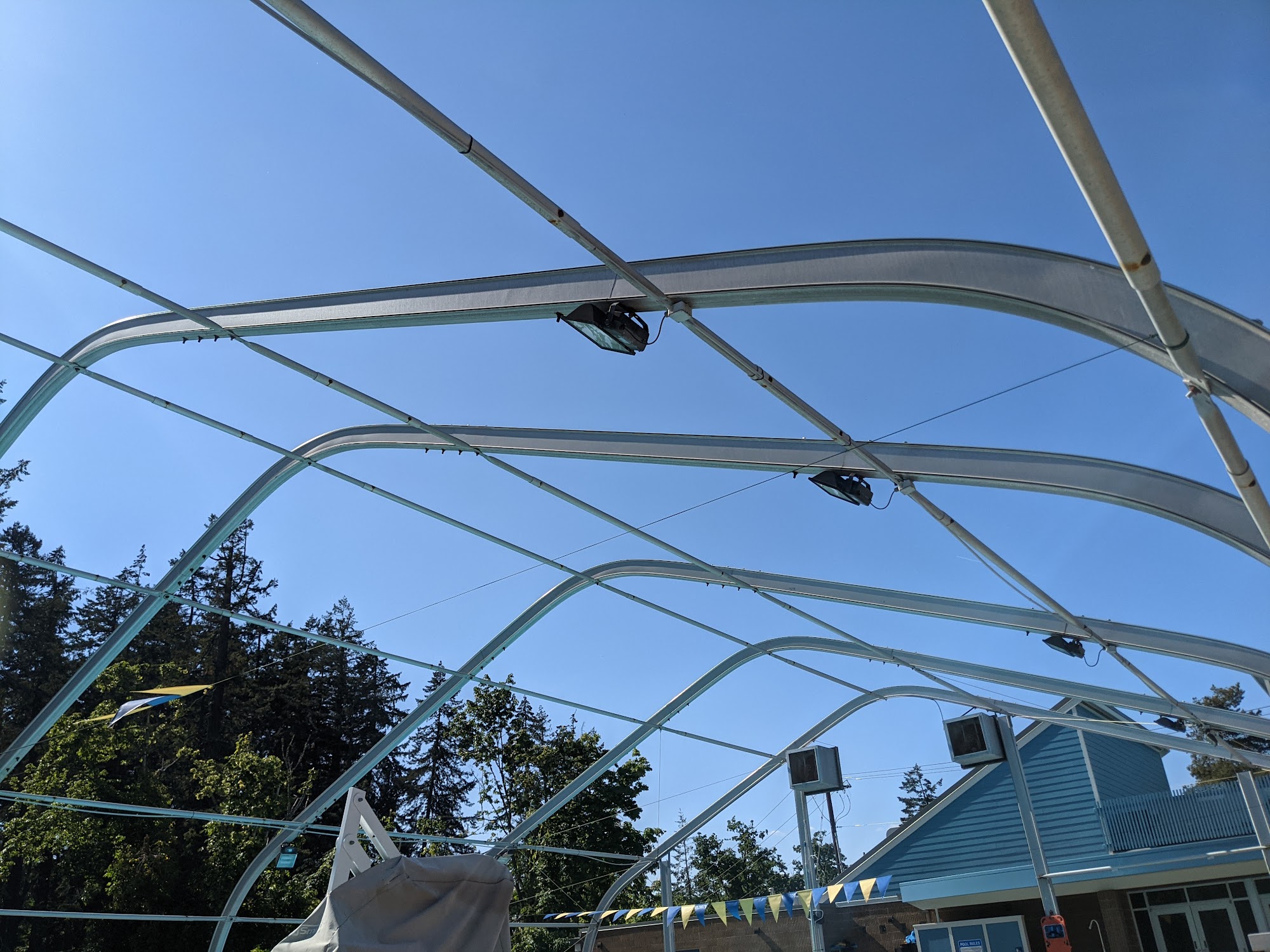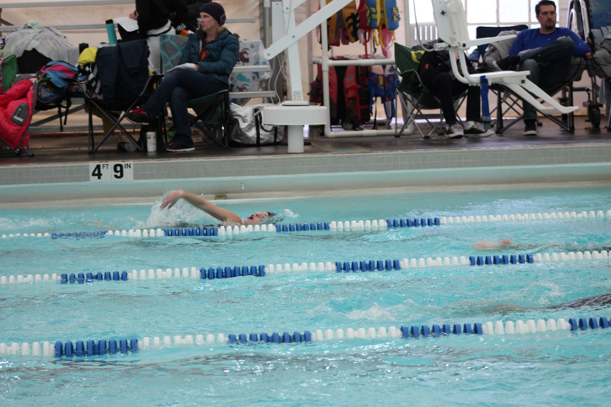 Very nice community pool, with life vests for non swimmers, lifeguards, swim lessons, water exercise classes, swim teams, and community events. Covered in winter and open air in summer. Pool has big shallow part for younger swimmers, with zero depth entry to walk in, separate from deeper pool with lap lanes.
