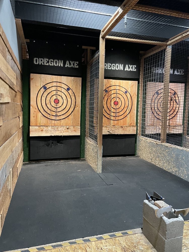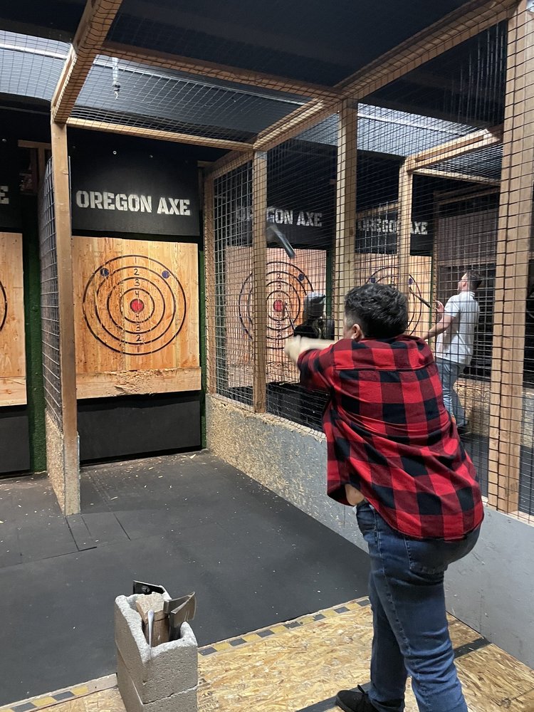 Oregon Axe is an axe throwing lounge in downtown Springfield, perfect for a unique and fun activity. It is great for a date night, an evening out with friends, or a birthday celebration. The experience is super fun and not repetitive, with points, different games, and one lane featuring a projector with creative targets. Sessions are a pleasant surprise, often longer than expected. The staff is consistently described as fantastic, engaging, helpful, friendly, kind, welcoming, funny, and cool. They are excellent coaches who do a great job teaching safety and tips, helping everyone stick the axe, which makes the experience out of this world. The atmosphere is welcoming and enjoyable even beyond the axe throwing itself. They are also very accommodating with rescheduling. The facility can host large groups for team building, with private cubes for up to 12 people and a party room that comfortably seats 12. It is highly recommended, with visitors stating they will definitely be back for the axe-cedingly great time.