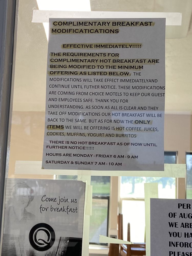 This Quality Inn is an older motel, but the room I stayed in was large, clean, and had a view of the golf course. The staff member who checked me in was excellent, displaying top-notch customer service skills. However, breakfast at 7:30 left something to be desired with hard eggs, cold potatoes, and a lack of coffee.