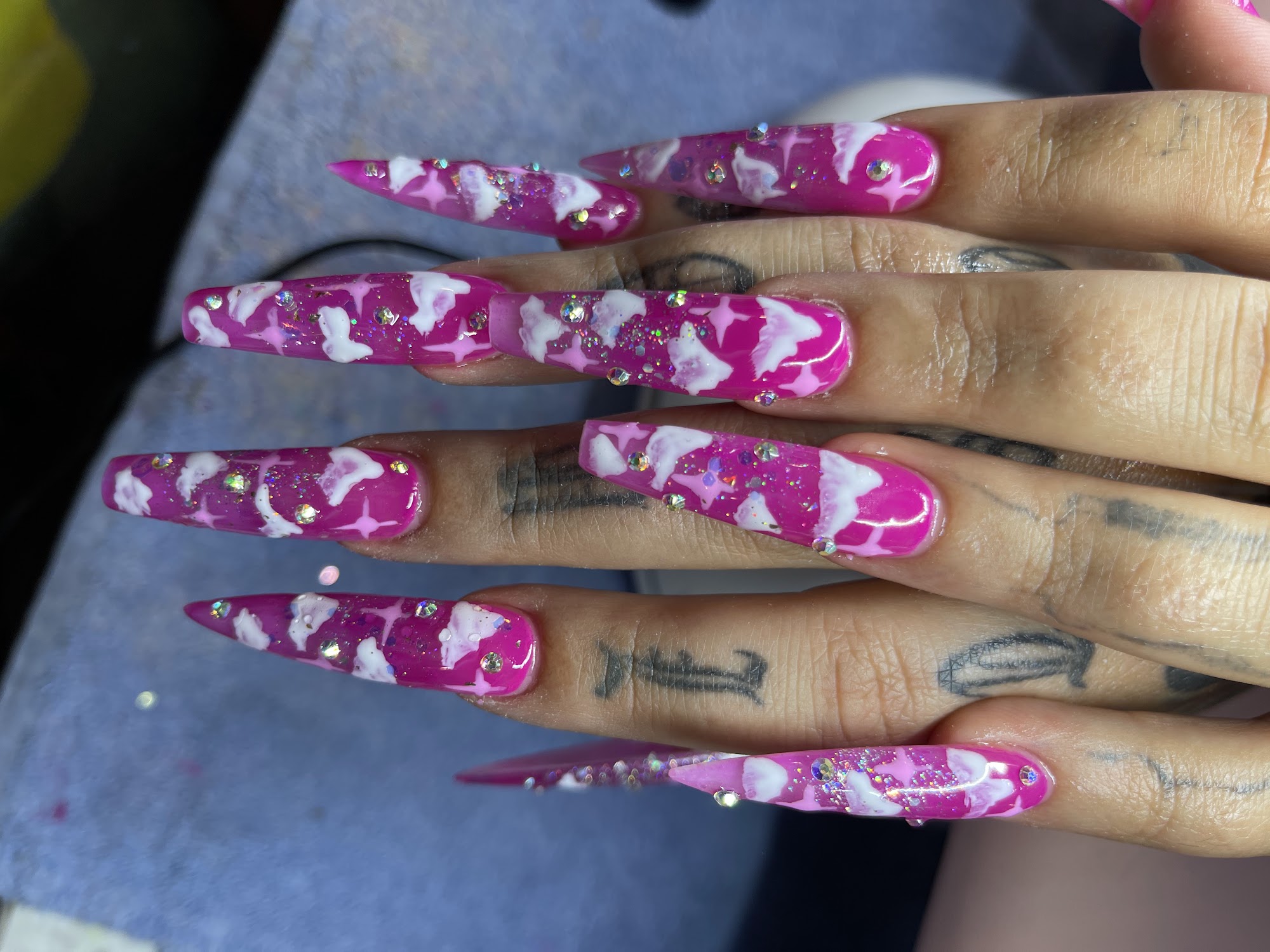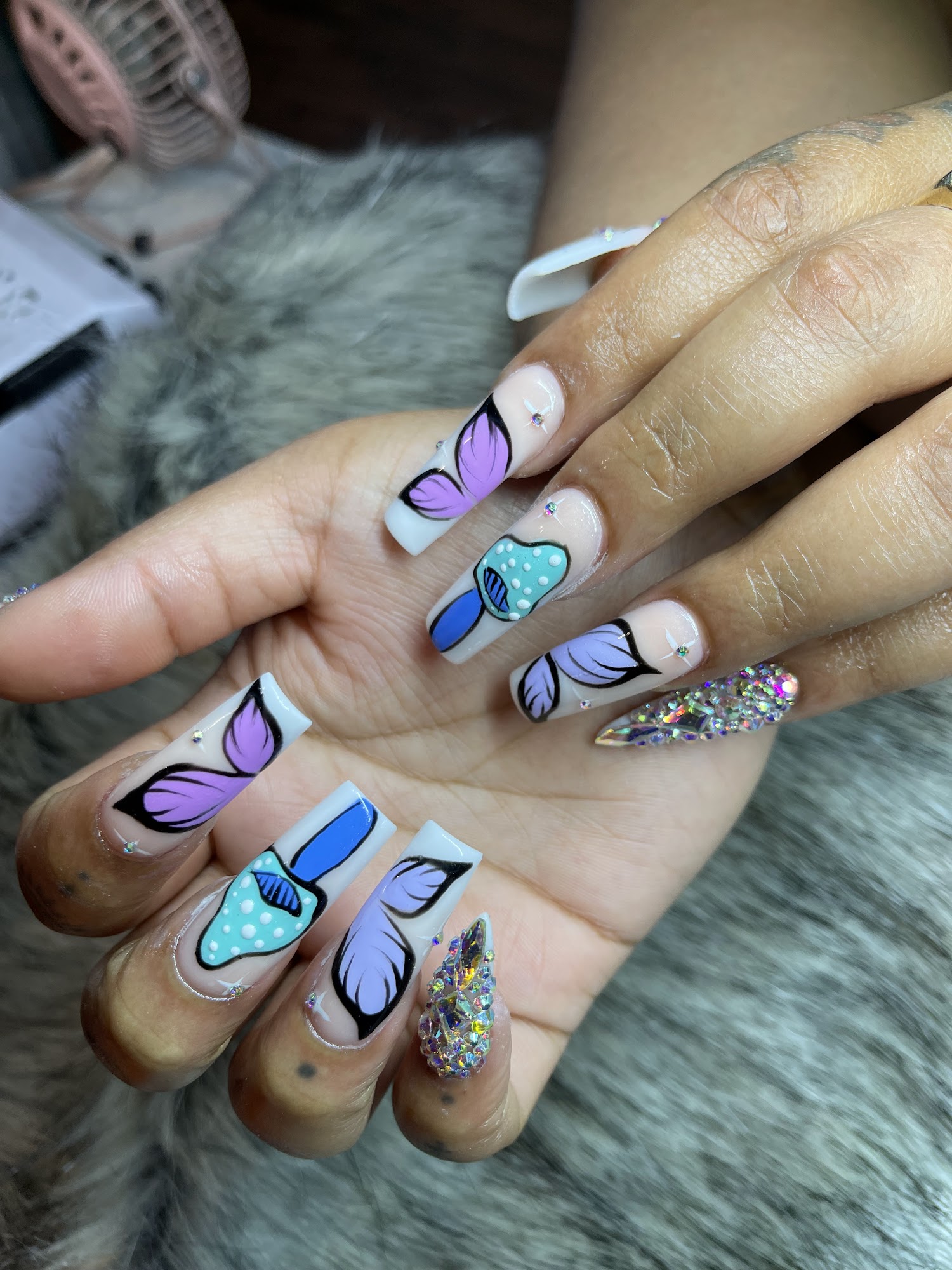 Love my nails cant wait to go back for my birthday set not sure the nail techs name but he did awesome and whew tiffany also she did my friends birthday set only have ss but they are beautiful💗(also price is for both sets)