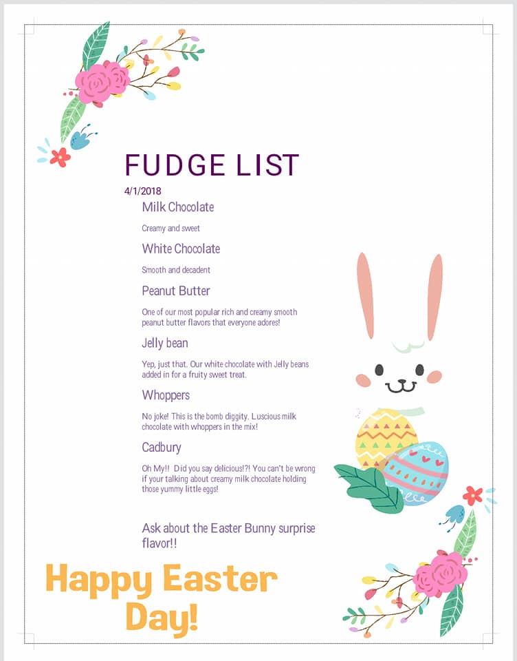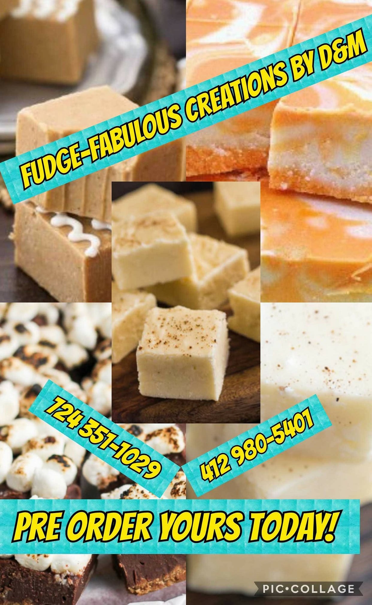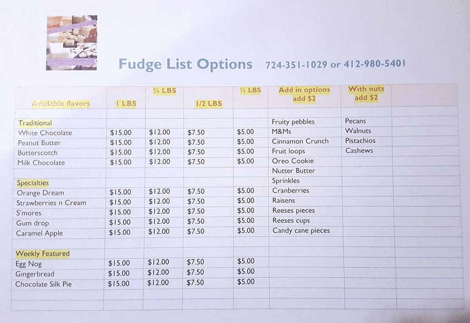 Business hours are by phone or appointment. We will take orders during that time and arrange pick up of order. We do not ship or deliver outside of our local area. We can be reached Monday through Friday from 9am to 9pm at 724 351 1029. We will do special orders if 3 or more pounds are ordered of the same fudge flavor.