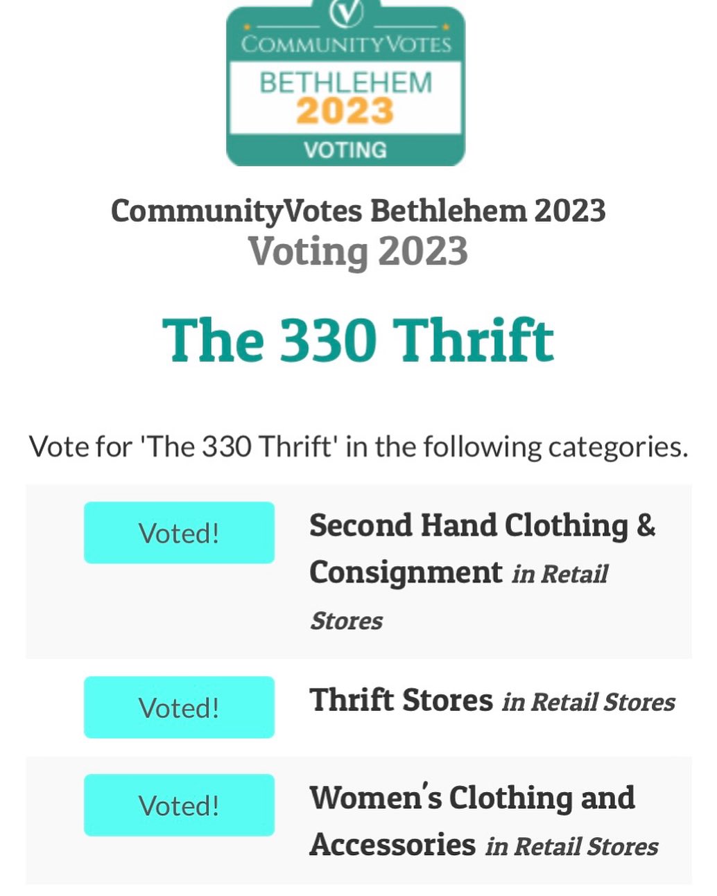 I never shopped thrift before until the 330 Thrift and it’s the only place I go. Cloths are very stylish, clean, presses and organized. The owner Michele is so helpful and amazing. I cannot wait until her new store opens. We did a privet shopping at her new place and it is so spacious and beautifully decorated
