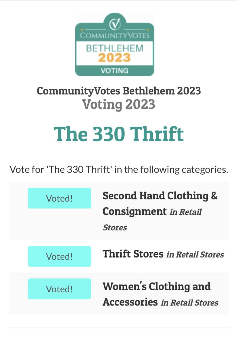 Neighborhood resale boutique specializing in women and mens clothing, shoes, handbags, and accessories at thrift store prices. The 330 Thrift accepts donations of all sizes, styles and seasons. Donations can be dropped off during normal business hours - no appointment needed. Any items not sold, get donated back to the community. We do not offer consignment at this time.