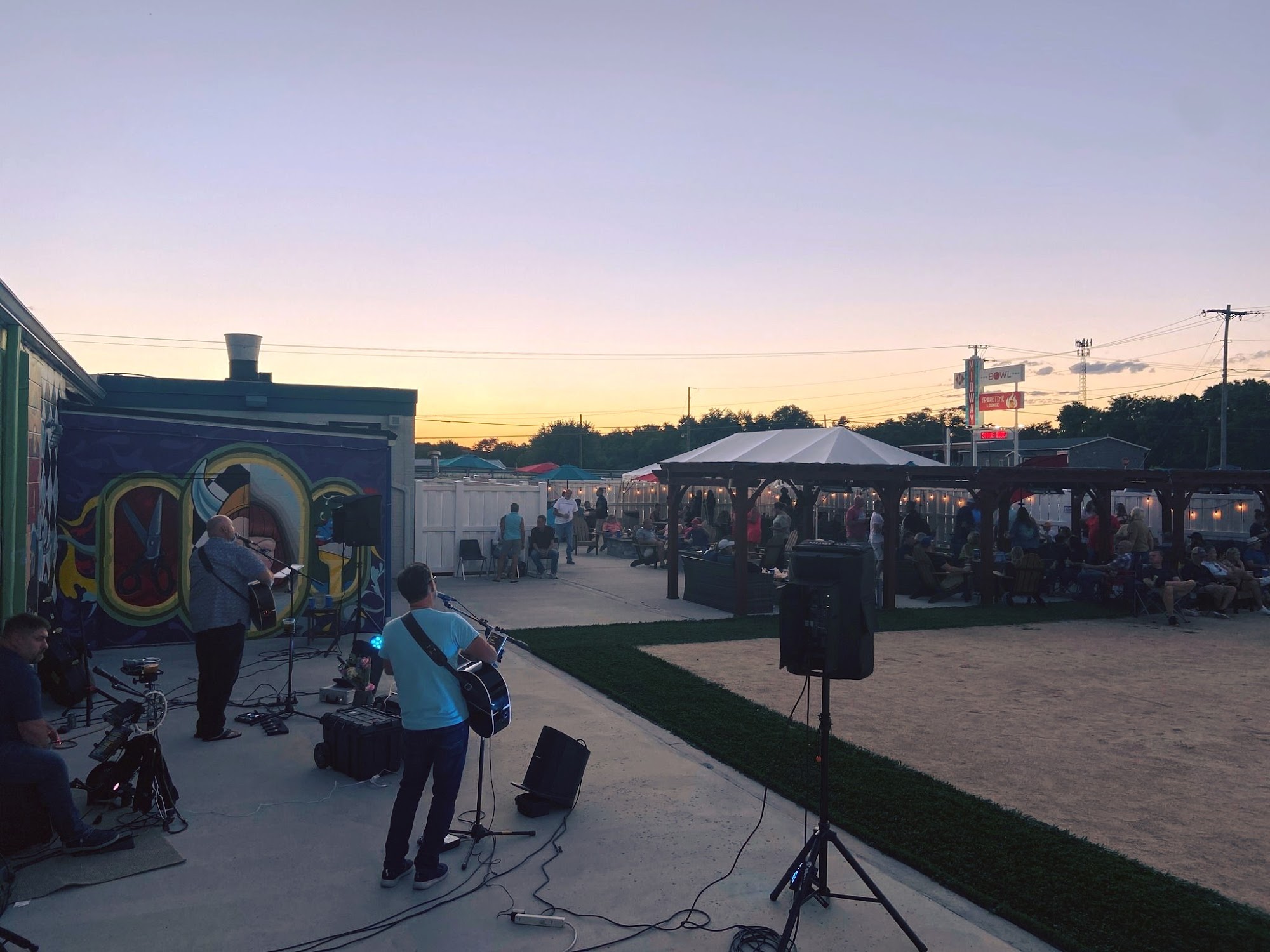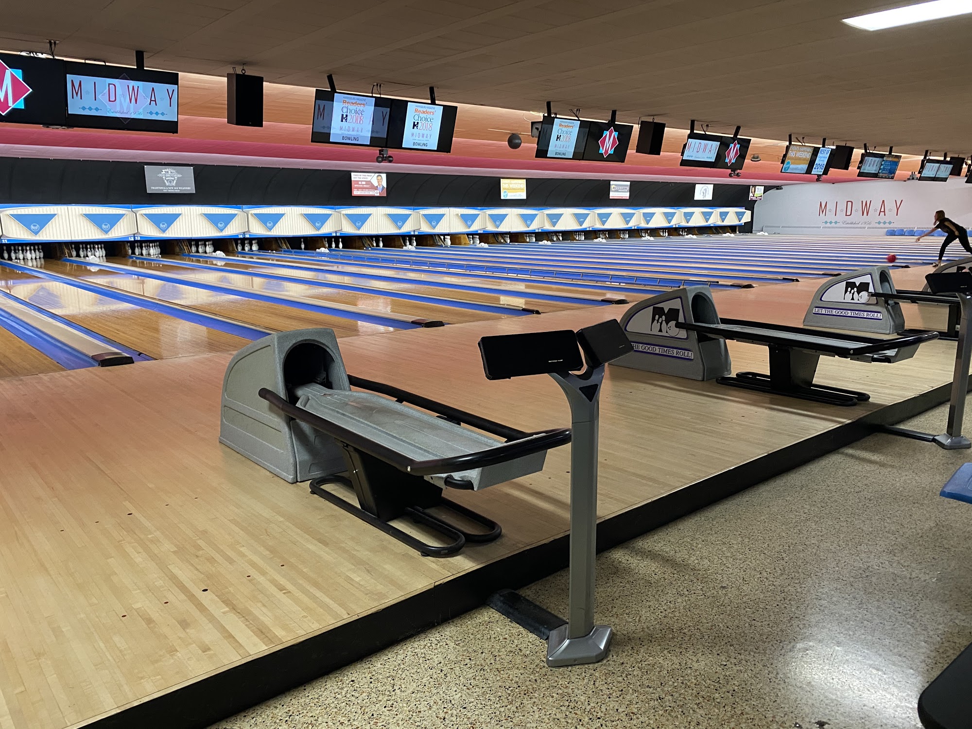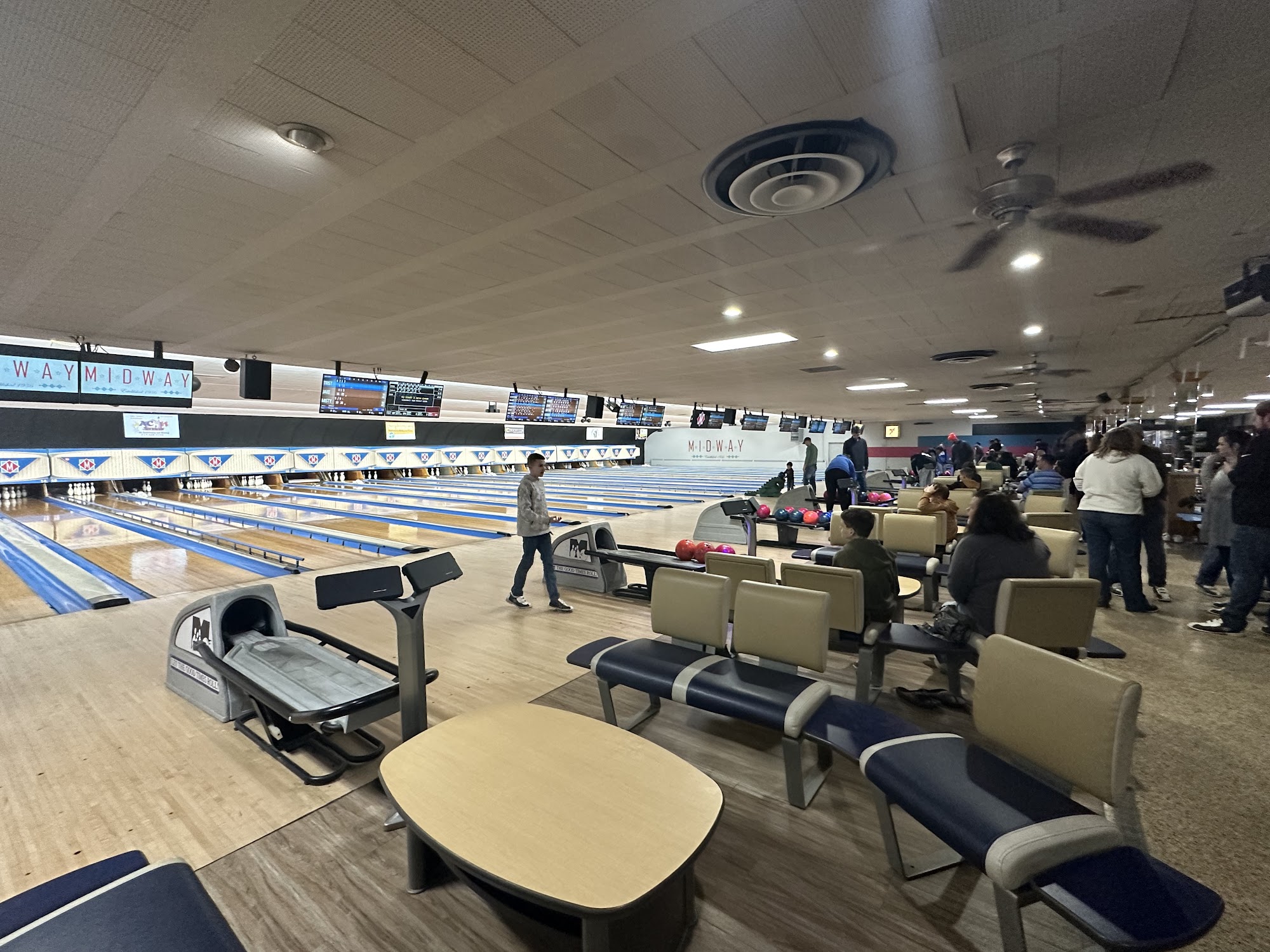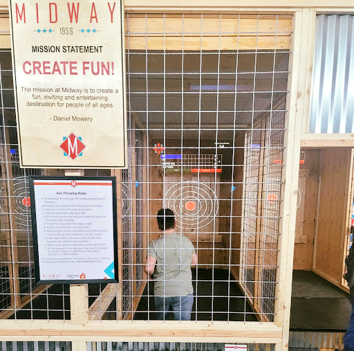 Midway Bowling Center is a year-round, family-friendly entertainment destination. Visitors can enjoy bowling, axe throwing, arcade games, a golf simulator, and delicious food and drinks. On nice days, the patio offers live music entertainment. The mission is to create fun for everyone. Reviewers praise the new lanes, delicious food and drinks, and exceptional service from the staff. It's described as a great place to visit with friends, family, or for events, with a 10/10 overall experience.