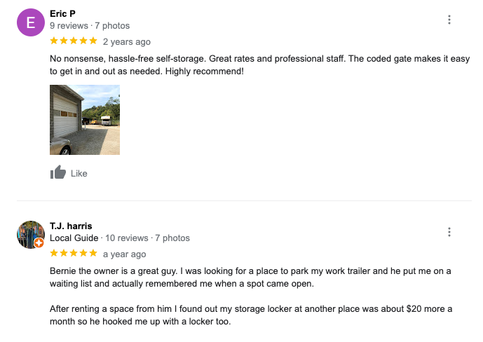 Great storage facility! Bernie is very kind and courteous. Responded quickly to the changes I needed to make. A pleasant experience!