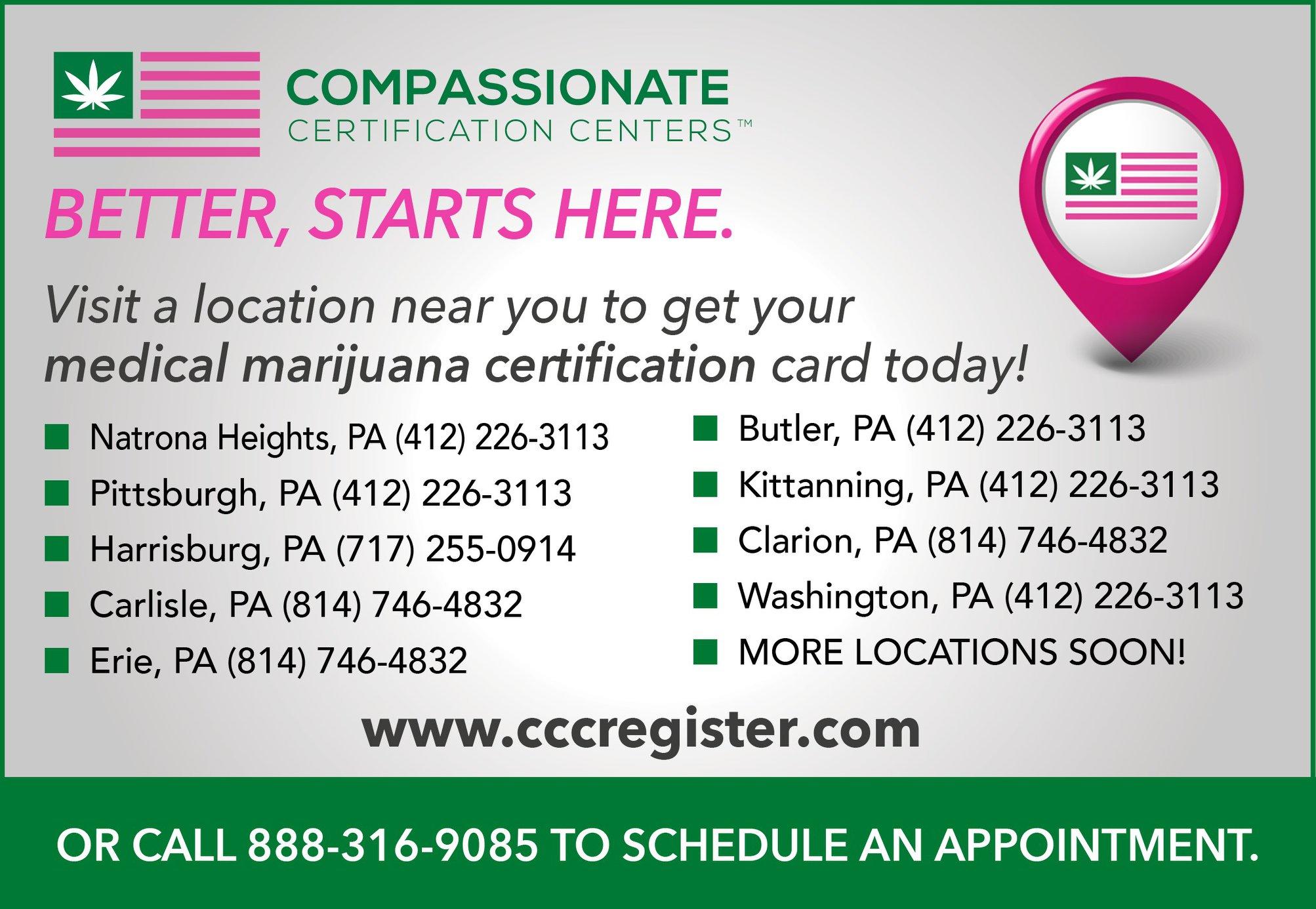 Compassionate Certification Centers (CCC) is an award-winning MMJ certification company in Pennsylvania that provides certification services, consultations, and treatment plans. Since 2016, we have been devoted to providing patients with cannabis-derived treatment options for a wide range of medical conditions. We’re here to raise the level of treatment that patients receive while seeking their PA MMJ cards by providing trust, clarity, and the diagnostic help to find the right medicine. The company maintains a state wide reputation for providing a patient-friendly experience in both a comfortable and supportive environment.