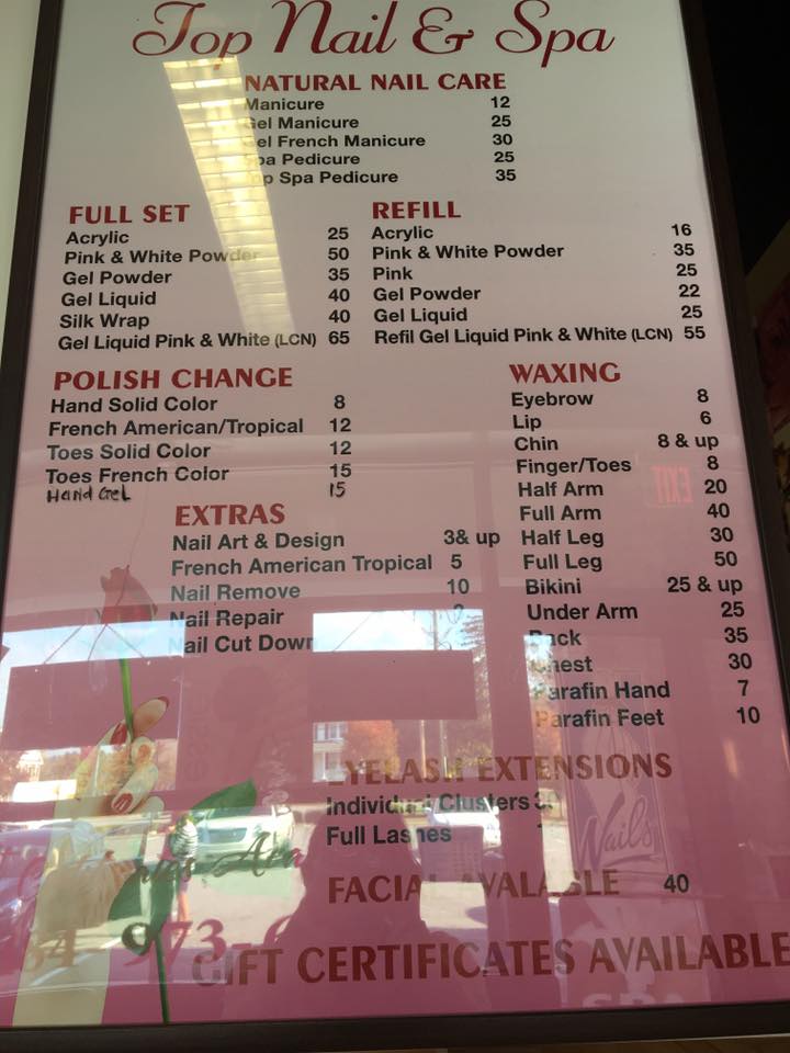 I have been going to Top Nails for years and they are amazing! The staff is friendly and always do a wonderful job for both manicures and pedicures. The salon is always clean. It is a very welcoming and relaxing environment.