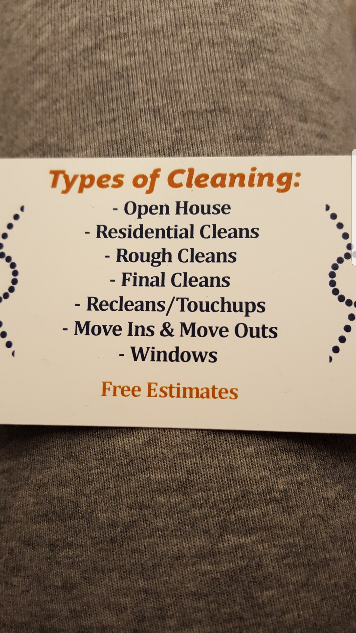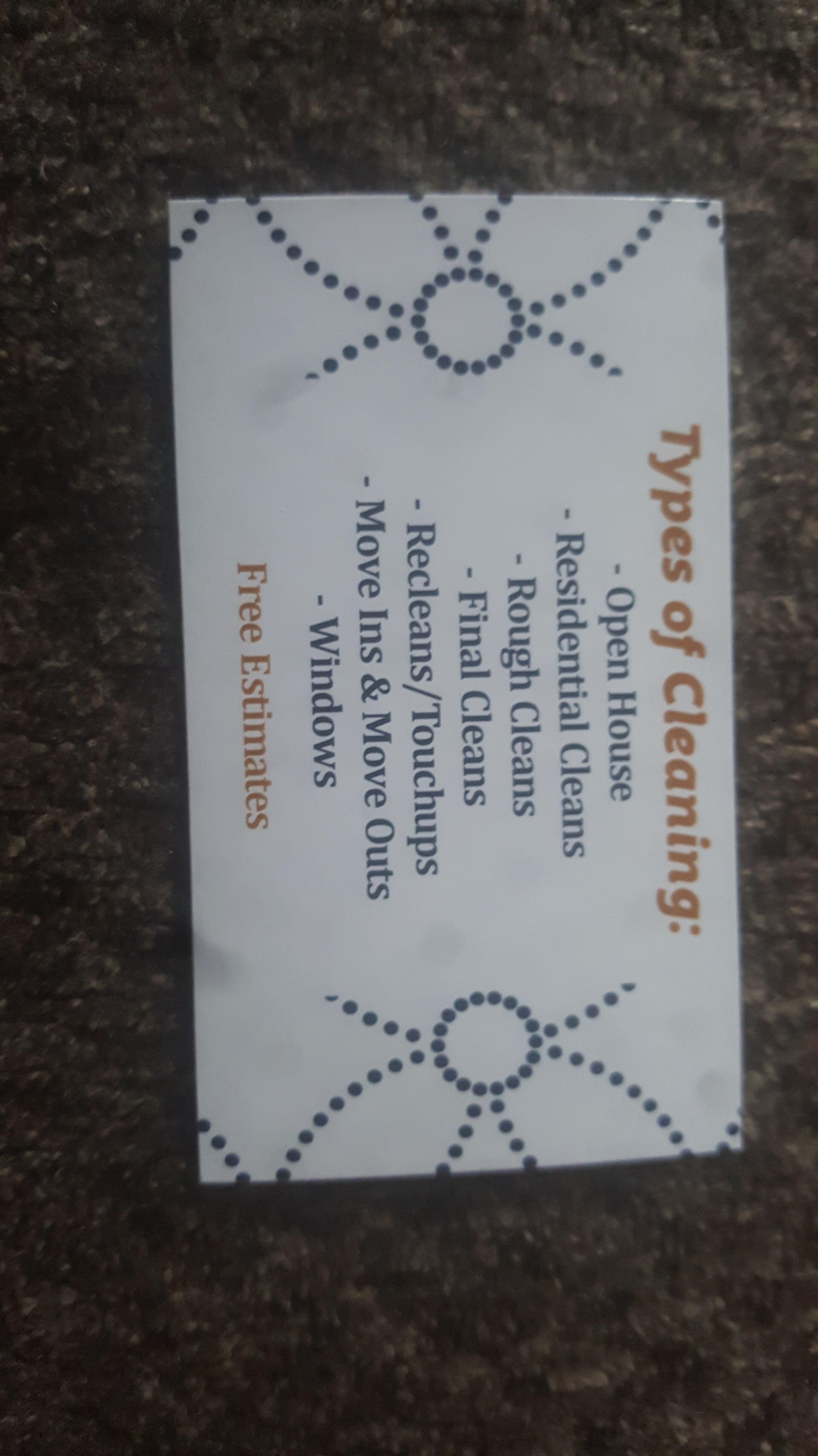 Our services Are as follow general house cleaning weekly to bi-weekly or once a month cleaning schedule. We offer move in cleaning as well as move out cleaning services . We can provide one time deep cleaning as well. Open house cleans. We provide rough and final cleaning on residential and commercial construction projects. We clean windows and provide free estimates on all of our cleaning services. We have our own cleaning supplies unless you prefer we use your own. we now offer carpet cleaning for residential homes contact us for a free qoute today