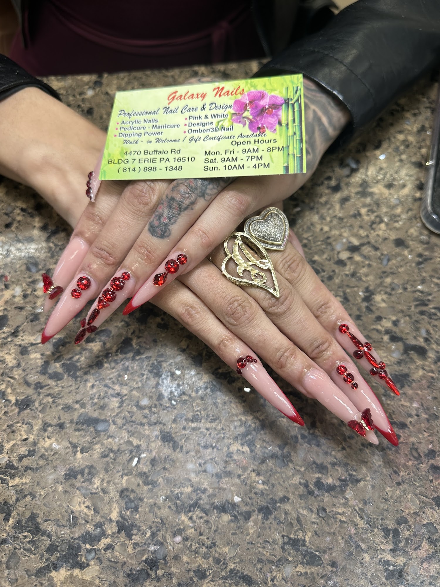 Galaxy Nails is a nail salon known for its special and hardworking staff, who create long-lasting acrylic nails. Customers often refer to the staff as "family" and appreciate their willingness to accommodate requests. The salon offers a friendly and chatty atmosphere. Jimmy did an amazing job and nailed the design, providing fast service. He was very gentle and did a wonderful job, making it a great and amazing experience. While there was a little confusion on a nail color, they quickly fixed it. Customers were super happy with how they came out and plan to go back again. It was a relaxing outing and everyone is complementing the results.