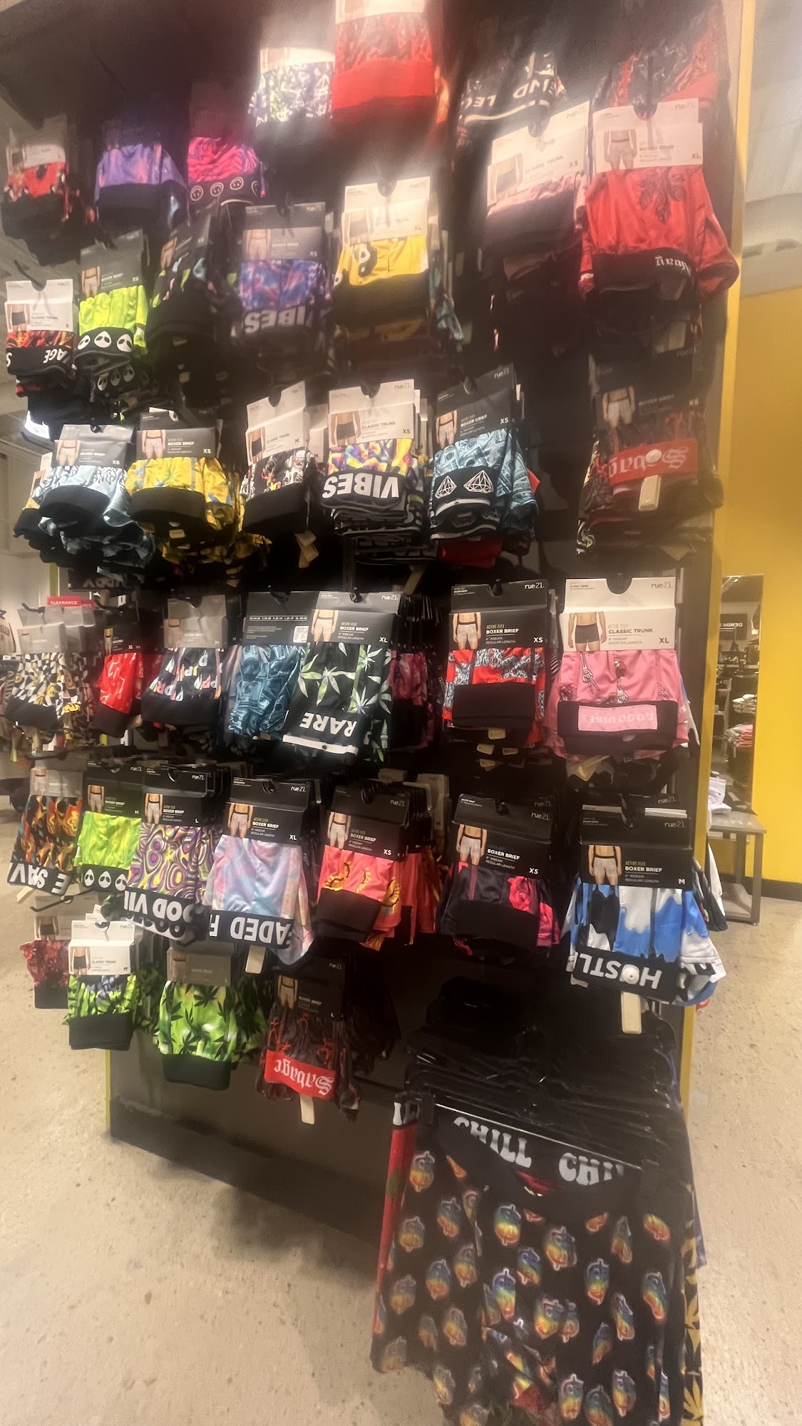 Wheelchair accesible .no Wi-Fi , clean sanitary , wide array of colorful casual ,lounge/sleepwear, under wear ,hoodies , jeans etc , this is my goto for weed prints pants , it has a nice atmosphere ,is friendly and has great sale prices