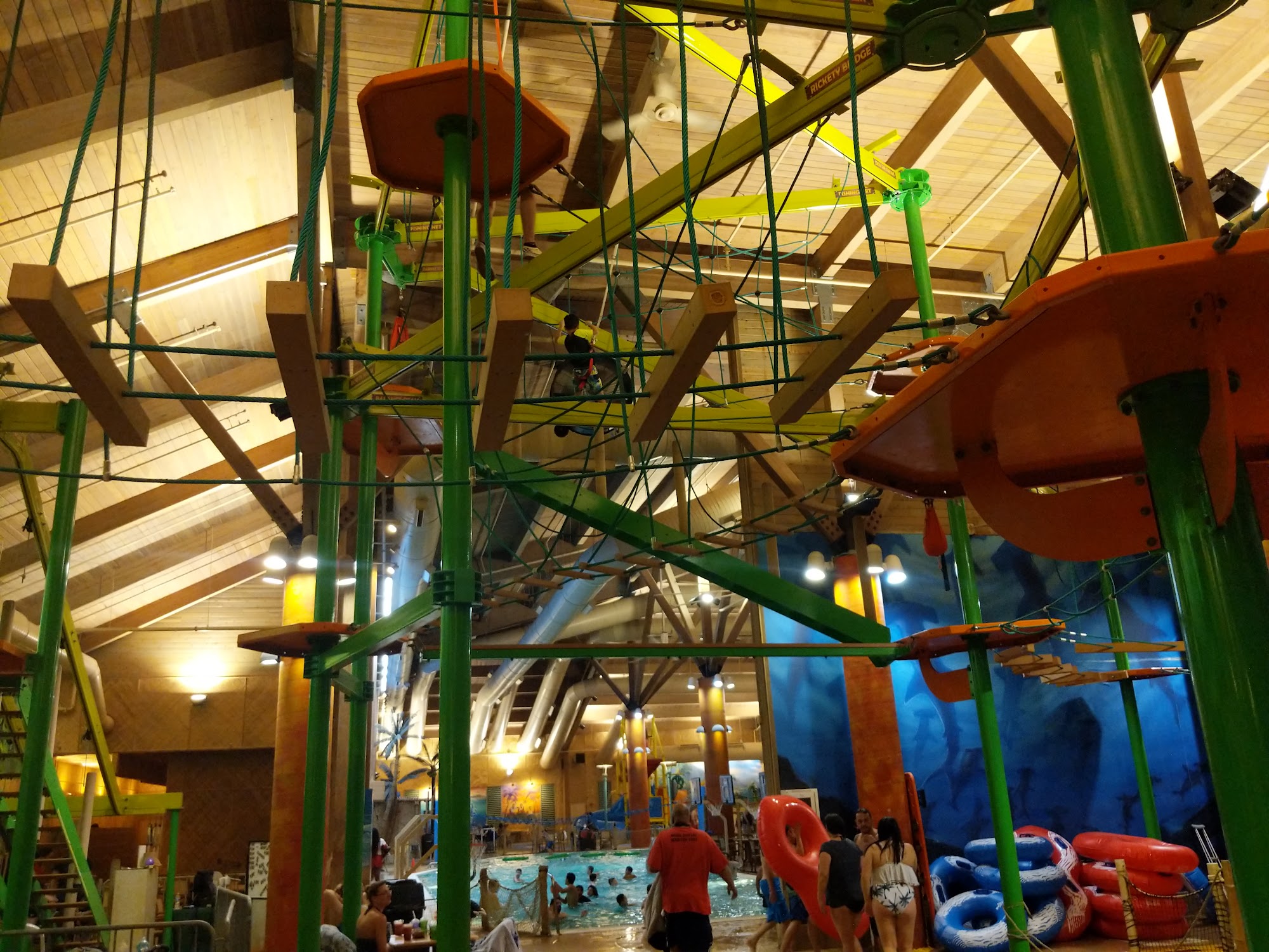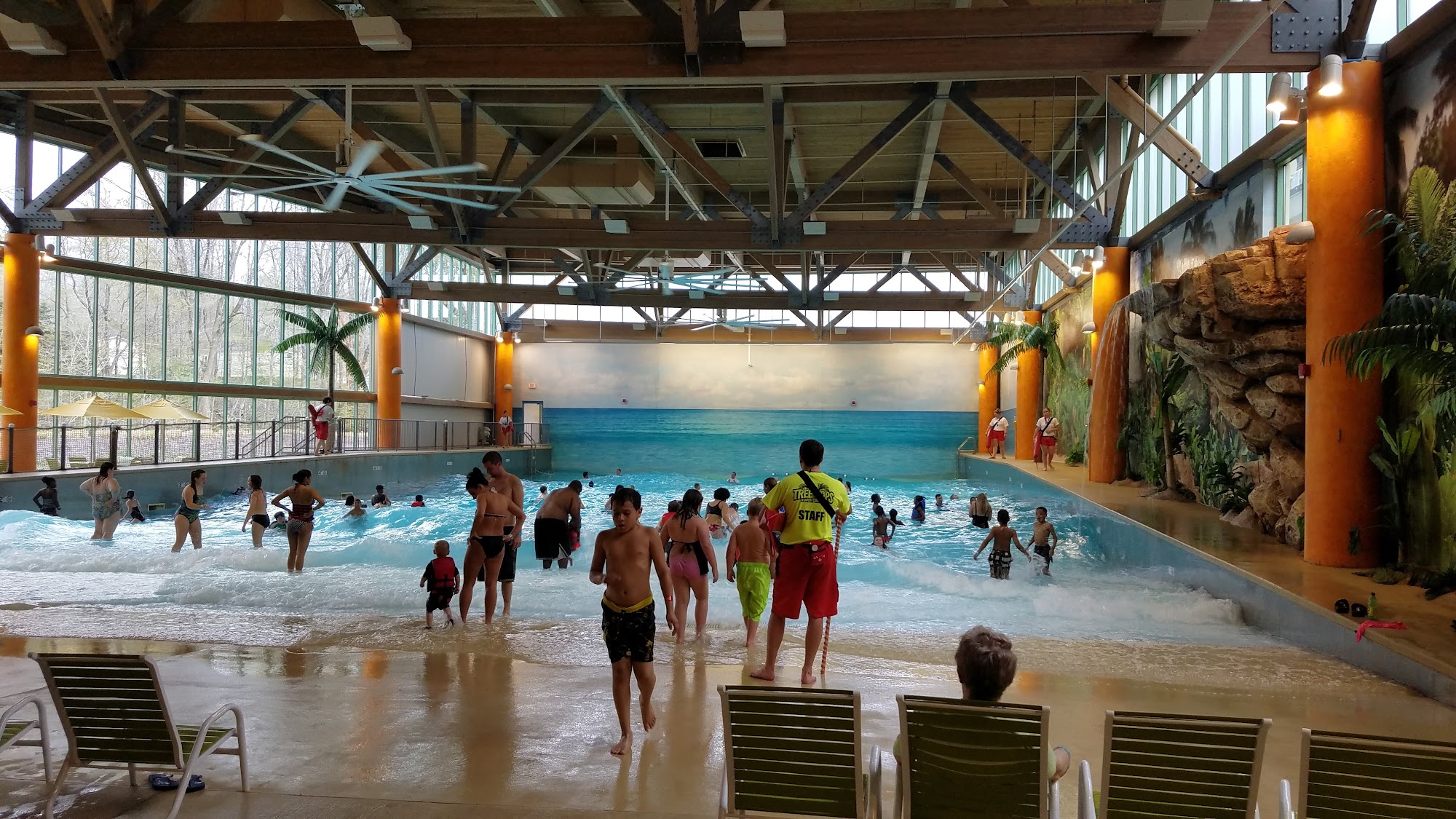 Splash Lagoon’s 84-degree tropical Polynesian atmosphere is ranked one of the Top 10 Water Park Resorts in the country by numerous industry trade magazines. The park was opened in March 2003. Since then, more than three million guests have enjoyed Splash Lagoon. Our park features nine water slides, pools, hot tubs, a 12-level interactive Tree House, a Tree Tops Ropes Course, and a 6,500 square foot Arcade with over 100 games. Guests will enjoy riding extremely tall waves made by the 200,000-gallon Wild Waters Wave Pool, one of the largest indoor wave pools in the eastern United States.