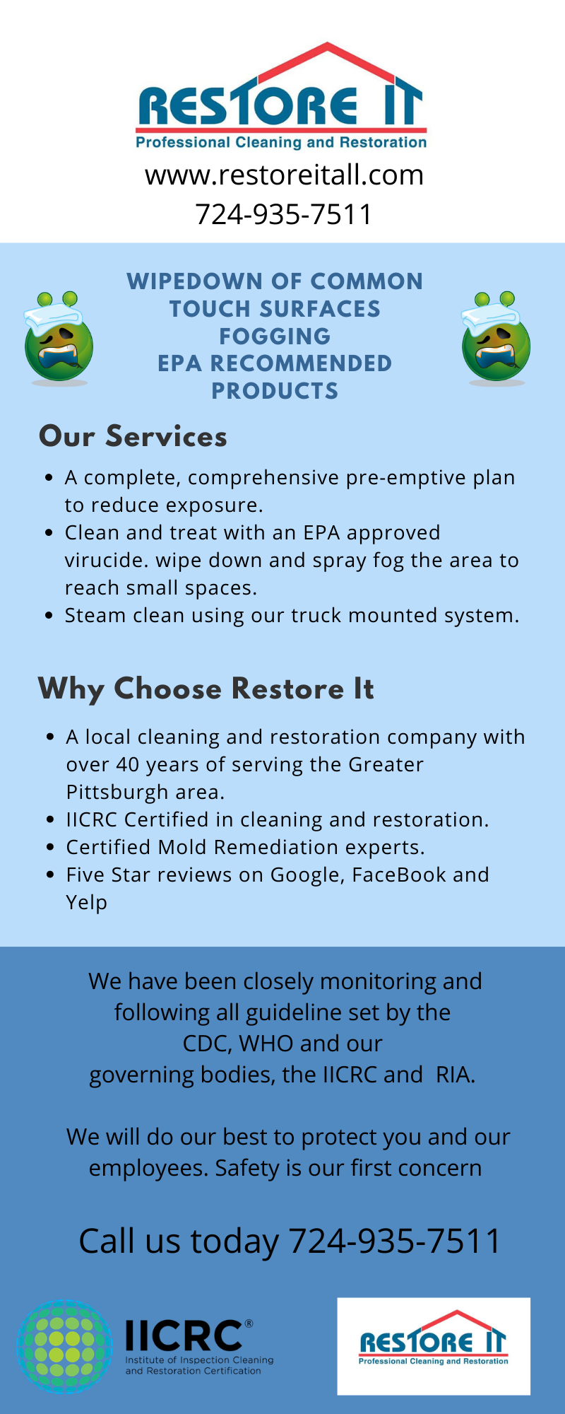 Restore It has brought customers high-quality carpet cleaning, water damage restoration, mold removal, and related services since 1980. No other Pittsburgh carpet cleaner can match Restore Its quality of in-home or business cleaning and restoration services. Our crews are professionally trained to handle any size job, big or small, commercial or residential throughout northern Pittsburgh, Treesdale, Sewickley, Cranberry, Wexford, North Hills, Beaver County and all surrounding areas. For emergencies, we offer 24-hour emergency water damage service from Fire Damage, De-flooding, Sewer backup, Mold and mildew prevention, Mold remediation and Basement Cleanup. We provide free estimates.