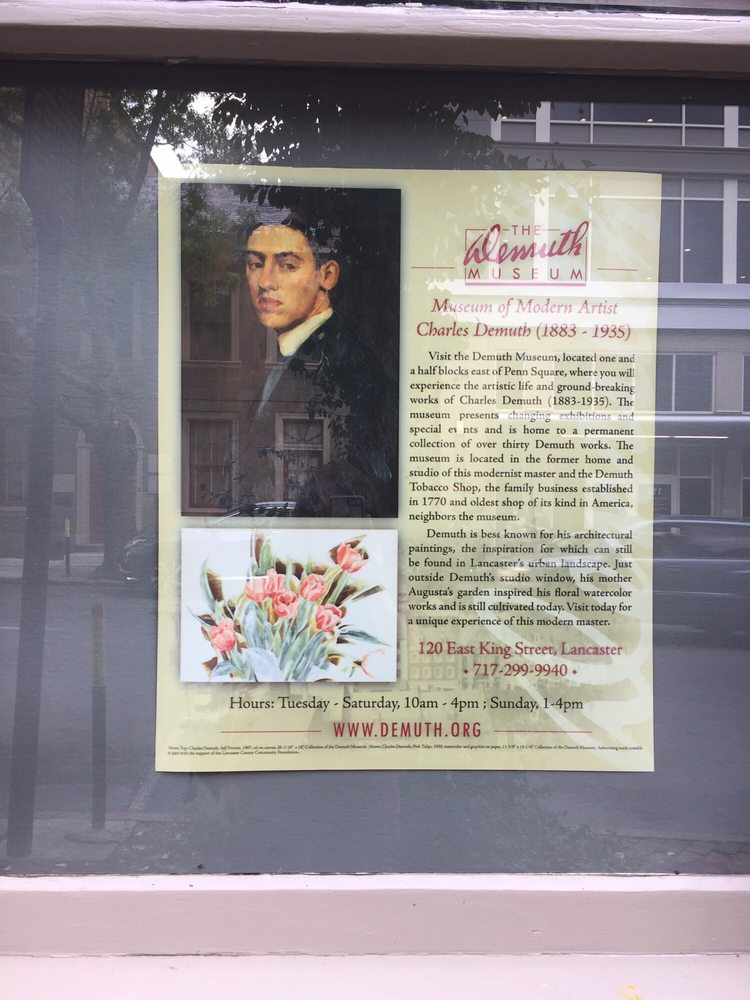 The Demuth Museum, the home and studio of American Modern artist and Lancaster native Charles Demuth (1883 - 1935), offers a unique experience of Demuth's artistic life and groundbreaking works through its collections, exhibitions, and educational programs. Visitation Time: The Demuth Museum is a small museum located in a historic rowhome. Visitors spend an average of 30-45 minutes per visit to view special exhibitions, selections from the permanent collection, and the Demuth Garden.