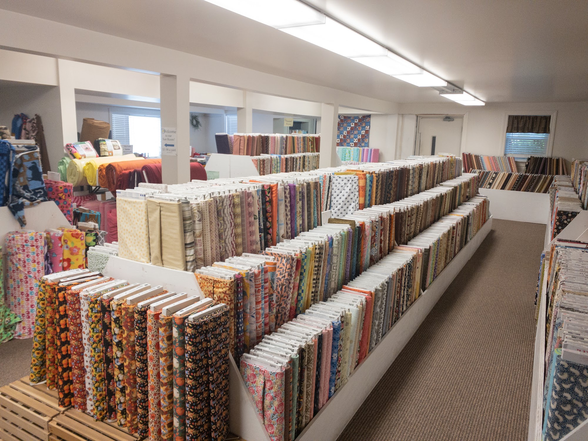 This is one of my favorite places to visit when I'm at my quilting retreat. Not only is it FULL of fabric, notions, sale goodies, but it is so well organized by color/theme/designer. It is handicap accessible for both floors, staffed with helpful and knowledgable people, and has the nicest atmosphere. Great prices, too!!