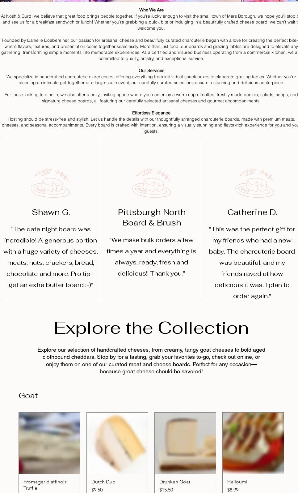 Nosh & Curd is a local small business serving clients with the freshest, highest quality ingredients. It is the cutest, most lovely place with a welcoming, laidback atmosphere and a positive vibe. The shop is well-decorated and cozy, with a small area set aside with tables, chairs, and a comfortable couch. Customers can bring their own beverage and dine in with a quick grab 'n go box of meats, cheeses, and accompaniments, or place an order for a unique quick bite, a flavorful cheese-focused panini, or a noteworthy salad. The business is absolutely amazing and a clear standout. It offers delicious and exciting things to try, including an amazing selection of artisan cheeses from all over the world not otherwise found in the area. They also feature lots of other goodies, like bakery items, a large variety of flavored and unflavored olive oils, vinegars, and various retail items from other local small businesses. Their charcuterie boards and options look absolutely incredible, are beautifully presented, generously portioned, and always incredibly fresh. The curated Curd Collection box is a fun experience with well-curated new cheeses and meat selections to try. The coffee is delicious and spot on for flavor, with unique options like the "Cinna-Sational" latte. Food items, such as the Ham & Brie Croissant, offer a nice balance of flavors and beautiful presentation. The staff is always awesome, accommodating, and super helpful, offering great service and willing to answer questions or make recommendations. Everything is so good and perfect to take to a party, making Nosh & Curd a must-visit shop and a definite hidden gem to check out.