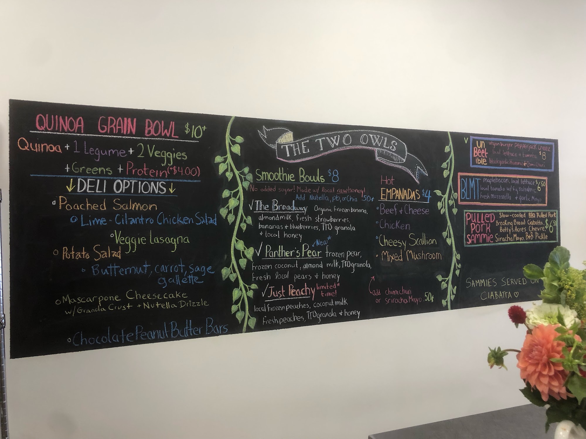 Two Owls is a charming local market and healthy lunch takeout spot in Milton, PA, dedicated to inspiring healthy living. The business works closely with local farms, bakers, butchers, artisans, and other local businesses to offer a variety of fresh, high-quality products, including bread, baked goods, cheeses, meats, fish, produce, kombucha, and gourmet items from Pennsylvania and beyond. Their menu features seasonal changes, with a selection of in-house prepared lunch items such as empanadas, smoothie bowls, grain bowls, and made-to-order sandwiches. Customers often praise the freshness and quality of the ingredients, highlighting delicious sandwiches like the BLT with mozzarella and balsamic, and flavorful grain bowls with quinoa, chickpeas, steamed broccoli, and purple potatoes. Vegan and vegetarian options are plentiful and satisfying, with popular choices like sweet potato empanadas and stuffed peppers. The staff is described as friendly, accommodating, and easy to work with, making it a welcoming place for families and events, including weddings. Two Owls offers a cozy atmosphere and a variety of gourmet products, making it a favorite spot for healthy meals and a delightful shopping experience. Visitors appreciate the seasonal menu updates and the inviting community vibe, making it a must-visit destination for those seeking fresh, healthy, and locally sourced foods.