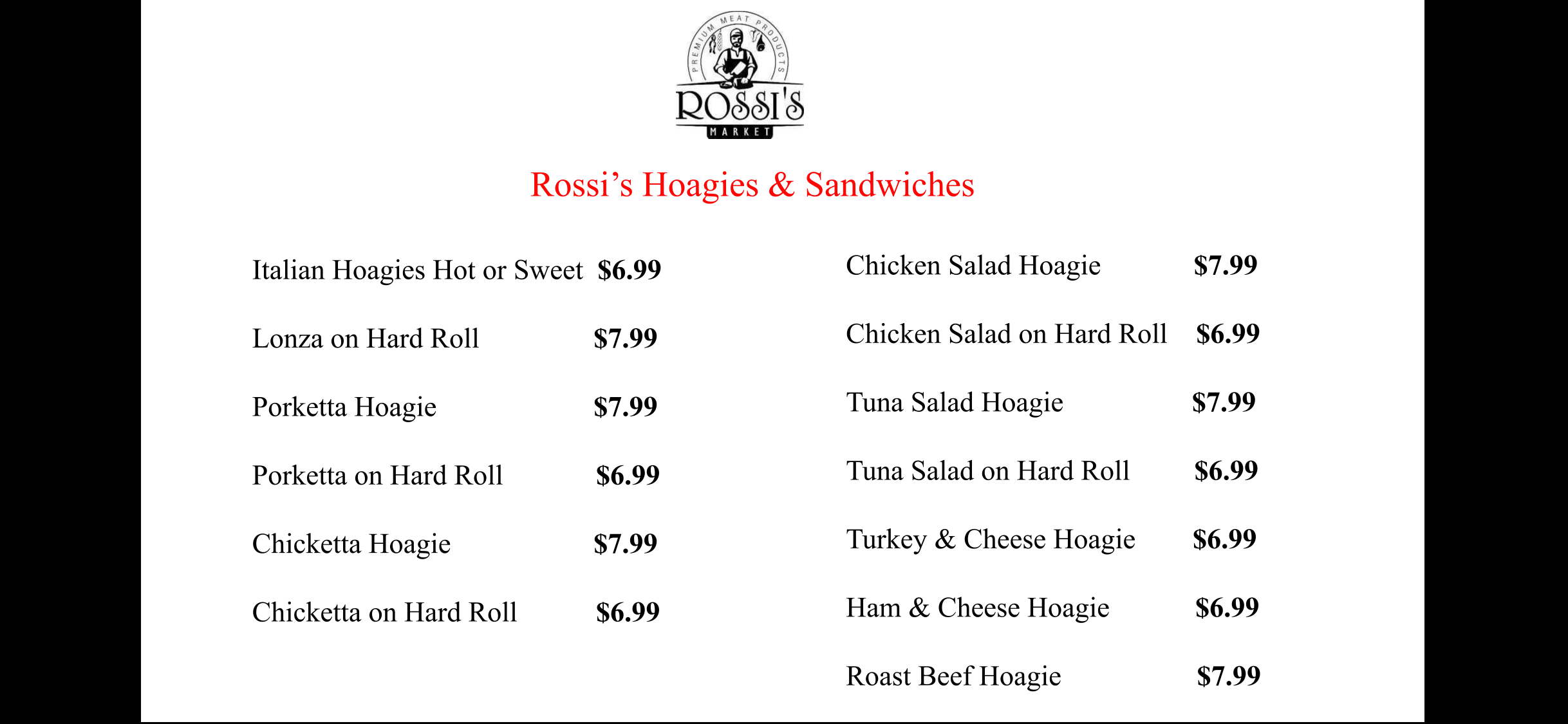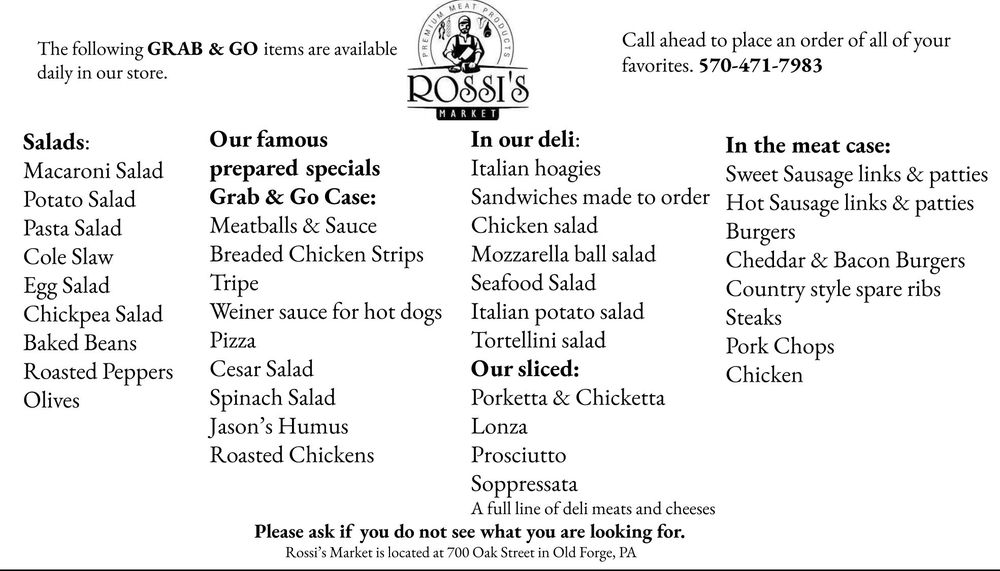 Rossi's Market is a neighborhood deli and butcher shop offering excellent food and quality products. The store is very well-kept with a great selection, including freshly butchered meats, homemade prepared foods, and a full line of Italian specialty goods. Customers recommend the amazing Italian hoagie, chicketta hoagie, homemade Italian sausage, porketta, salads, and more. The staff is super friendly, bubbly, very kind, and respectful, always greeting people with a smile. Prices are reasonable. With departments for produce, grocery, meats, delicatessen, and dairy, it provides everything needed for an amazing meal.