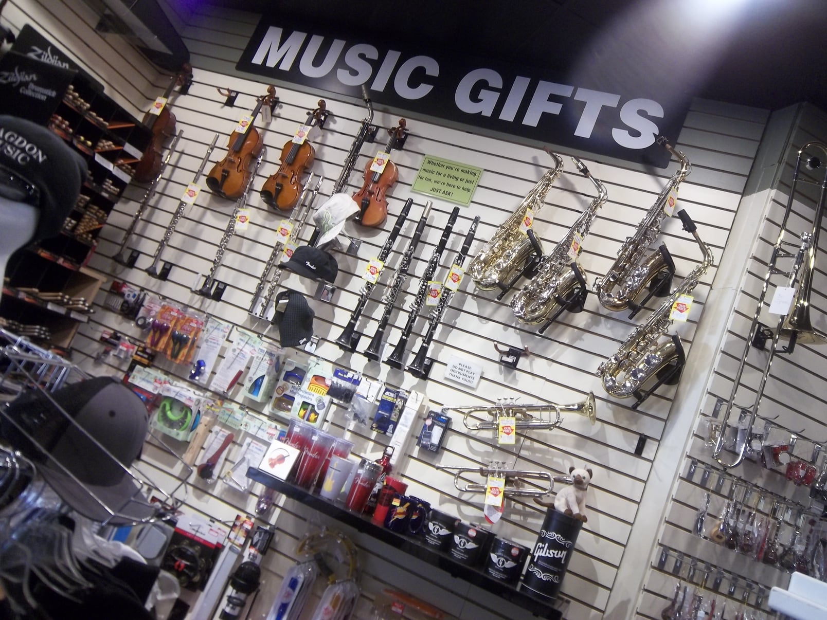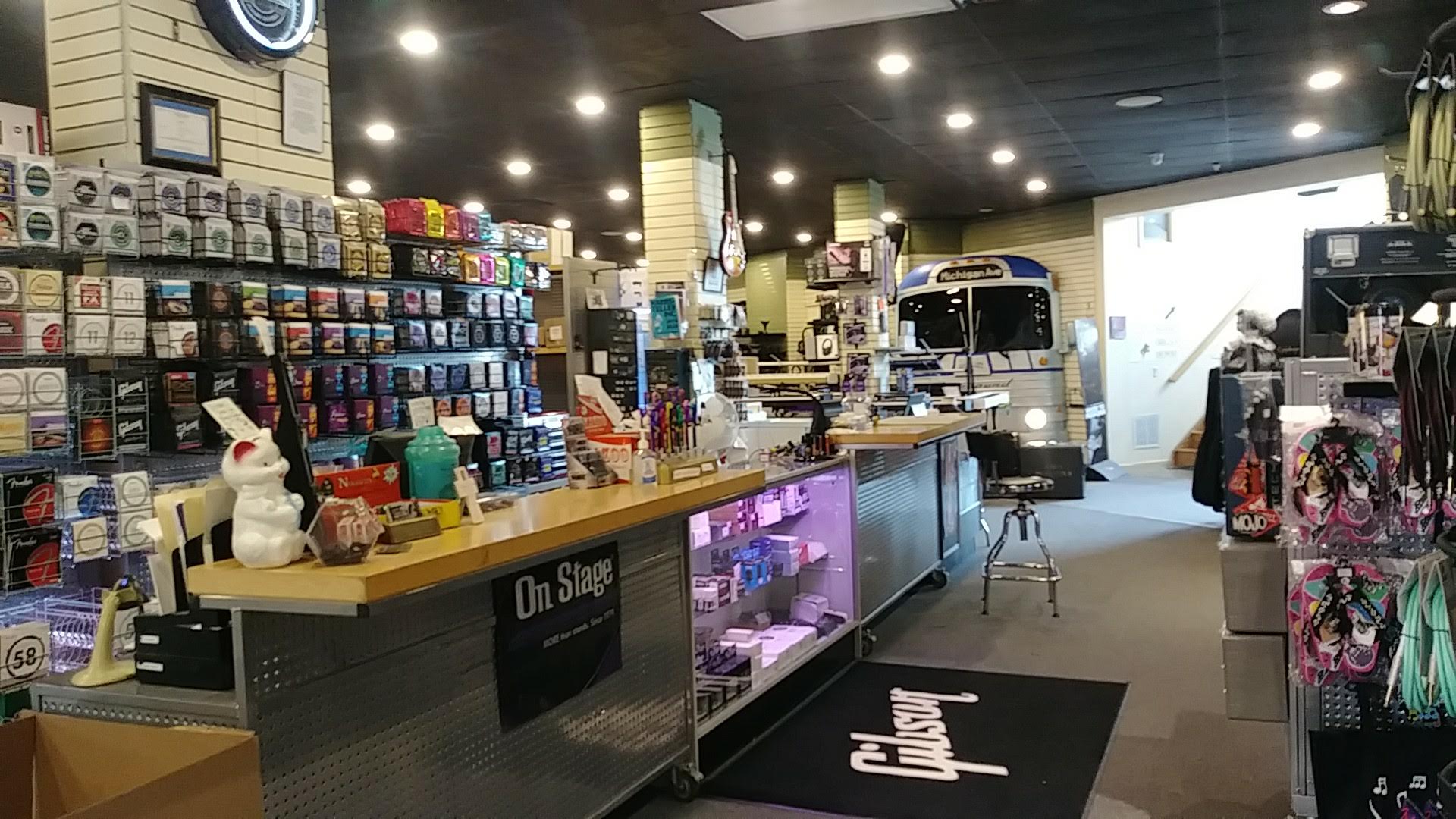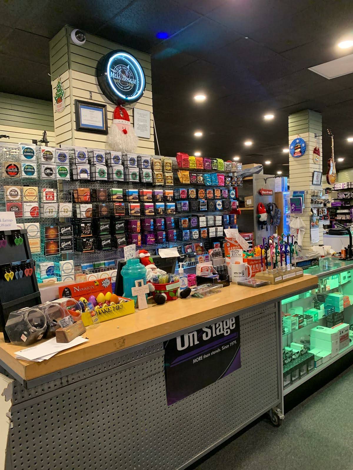 A full service music store featuring a large selection of guitars (both electric and acoustic), amps, straps, tuners, guitar parts and accessories, sheet music, band instruments, drums, pa gear, keyboards, unique gifts, gift cards, logo tee shirts & hoodies, violins, cellos, and so much more! We have repair service too for pa gear and guitars. Lessons too! Our showroom is full of musical gear!