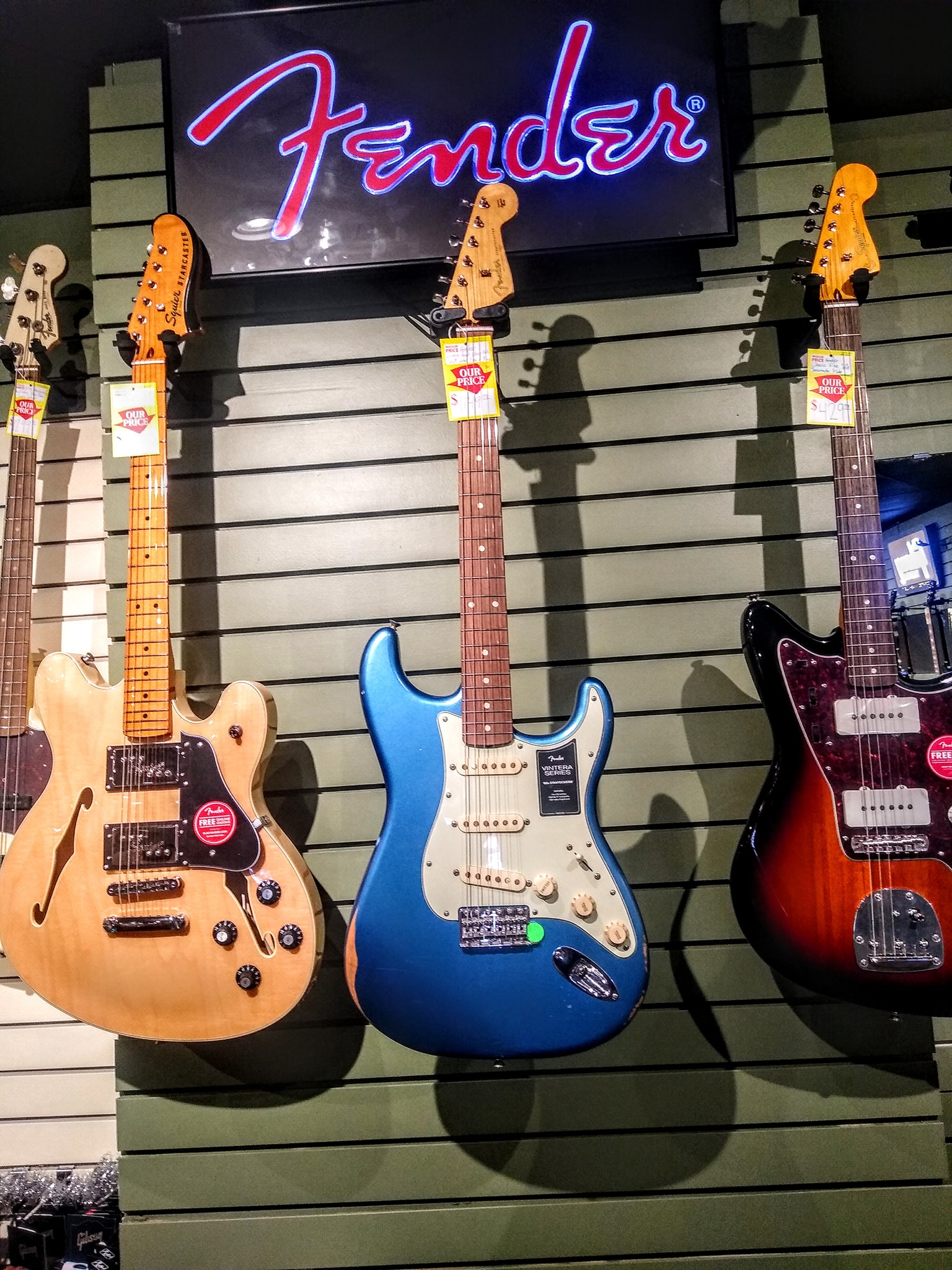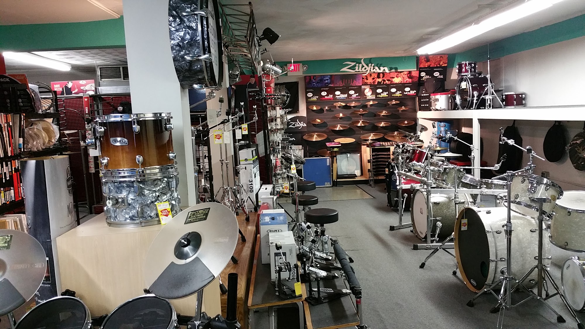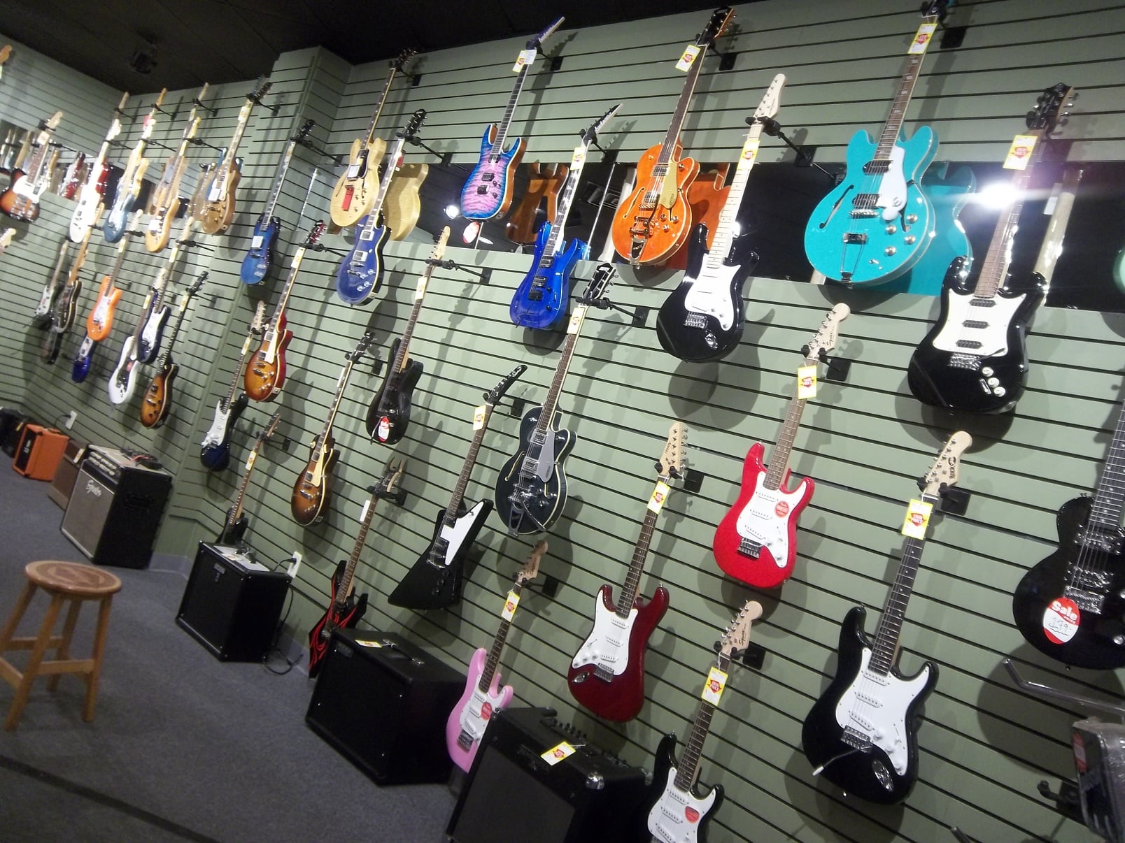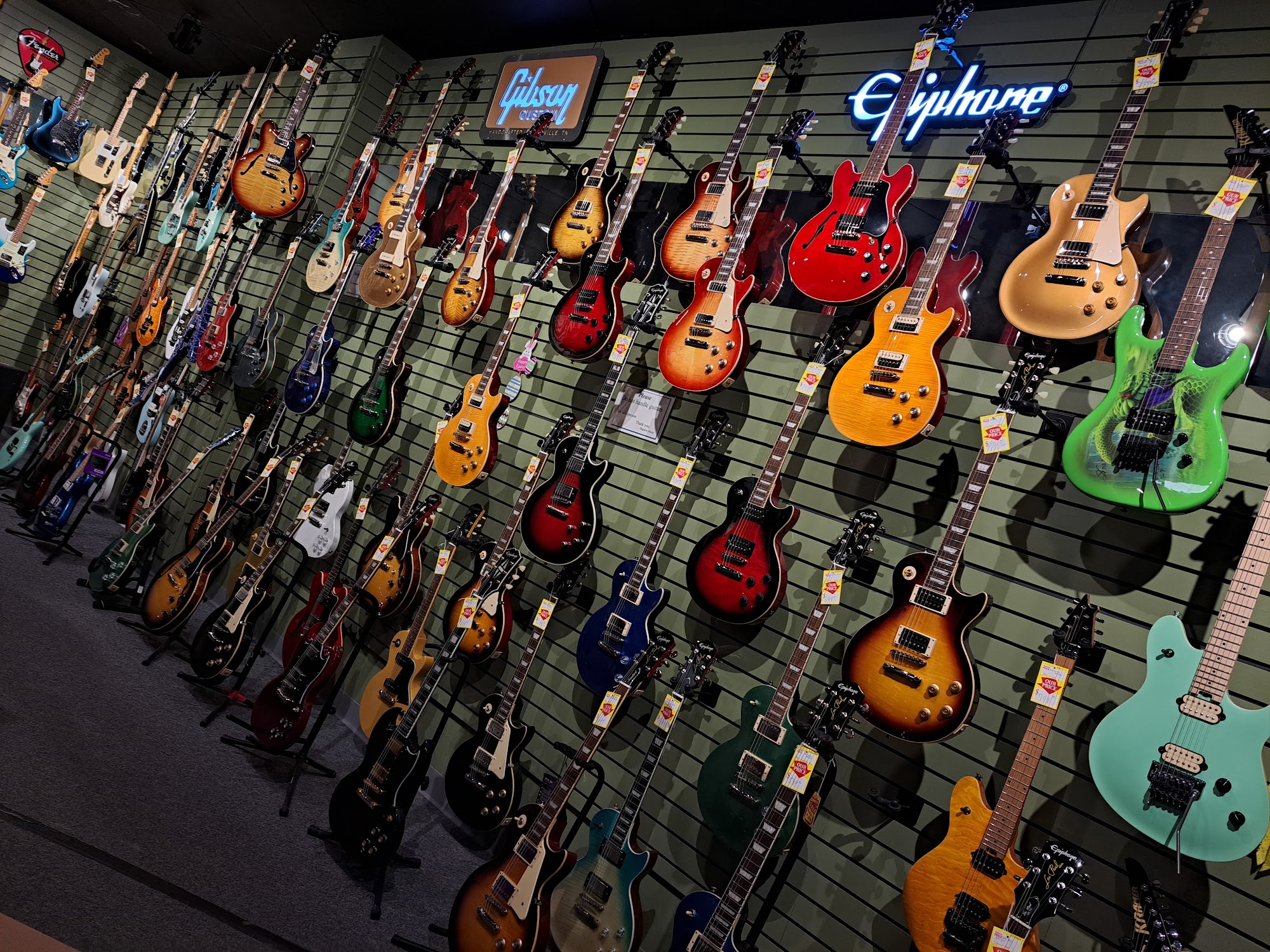 A full service music store featuring a large selection of guitars (both electric and acoustic), amps, straps, tuners, guitar parts and accessories, sheet music, band instruments, drums, pa gear, keyboards, unique gifts, gift cards, logo tee shirts & hoodies, violins, cellos, and so much more! We have repair service too for pa gear and guitars. Lessons too! Our showroom is full of musical gear!