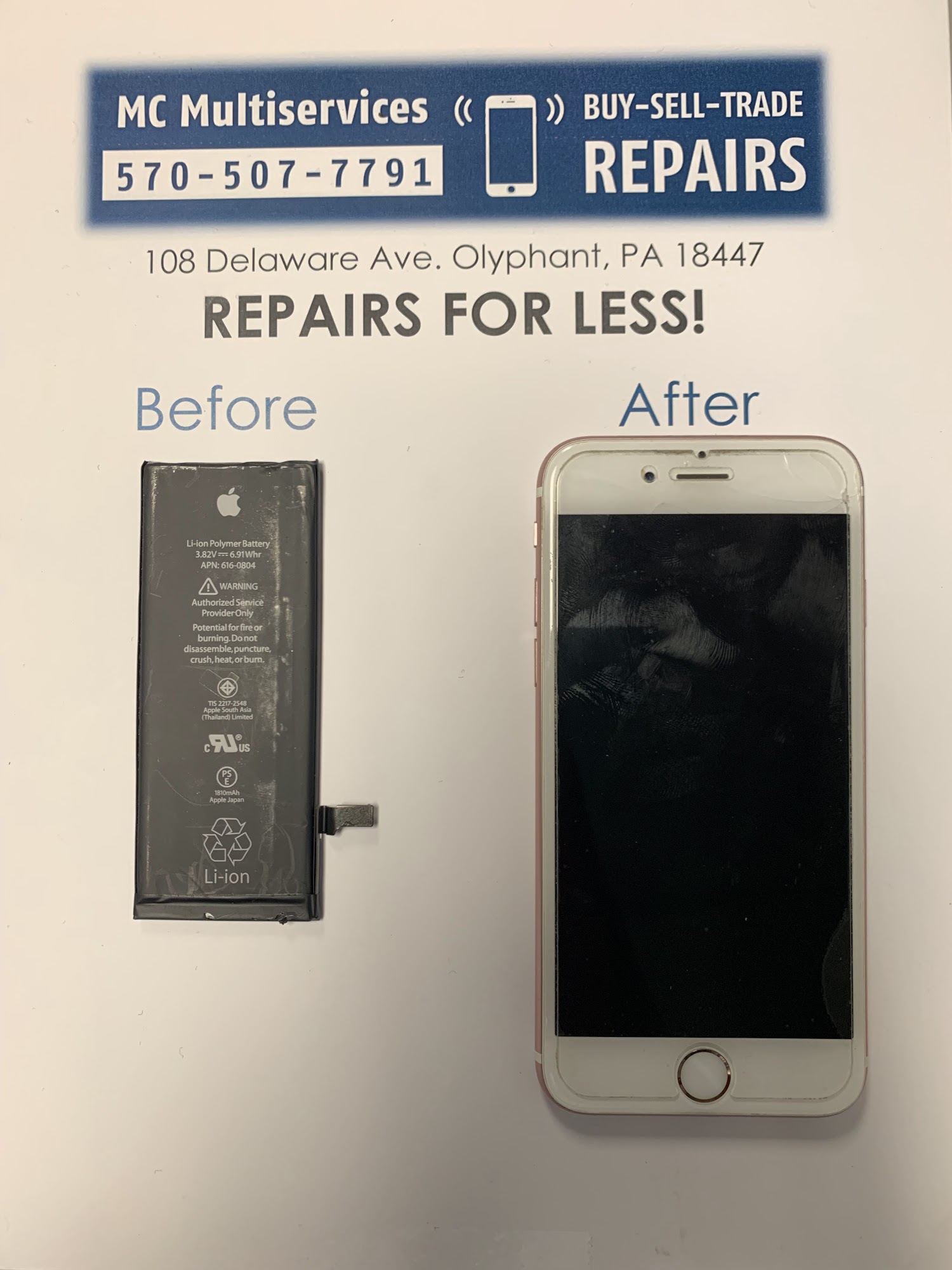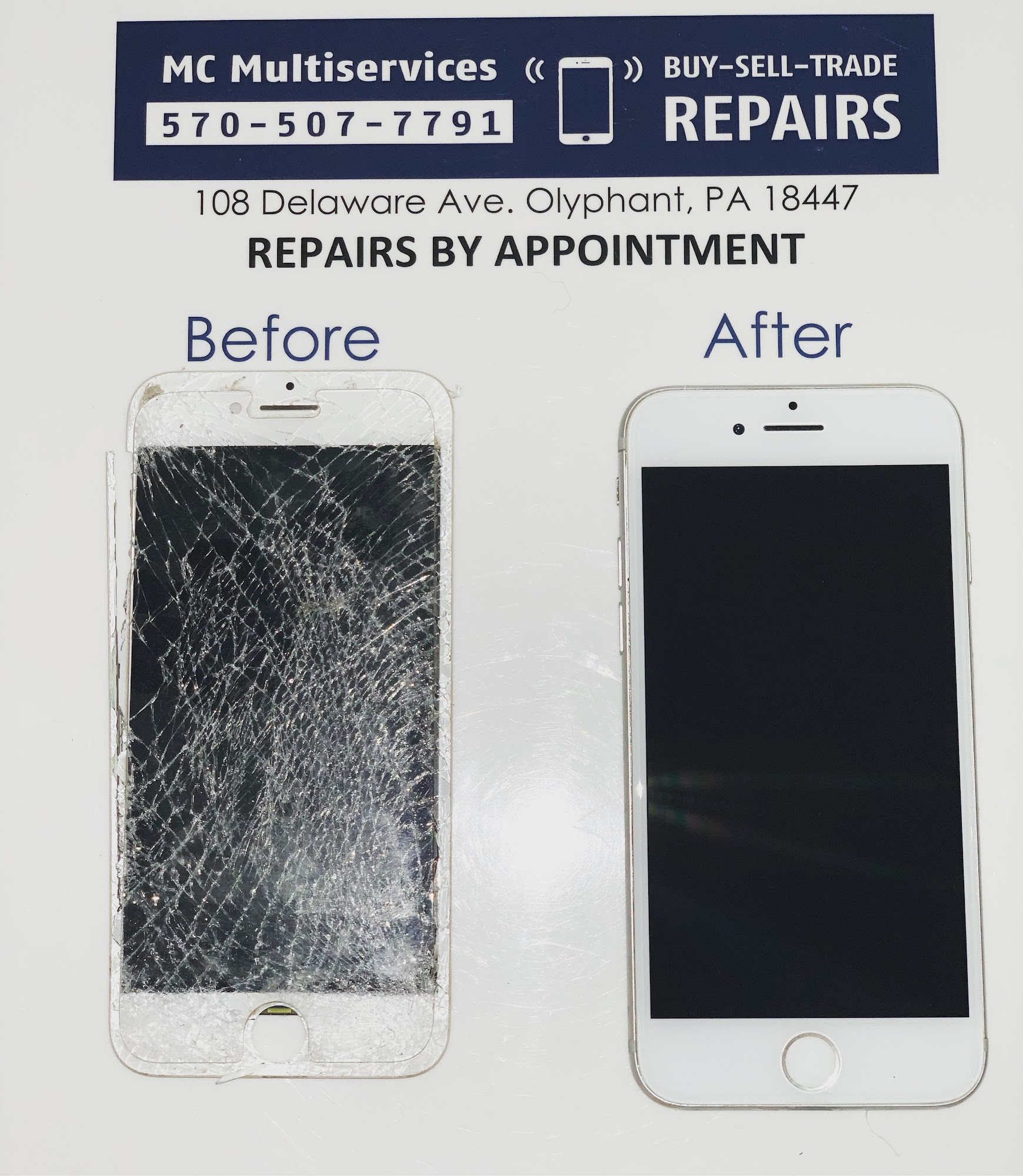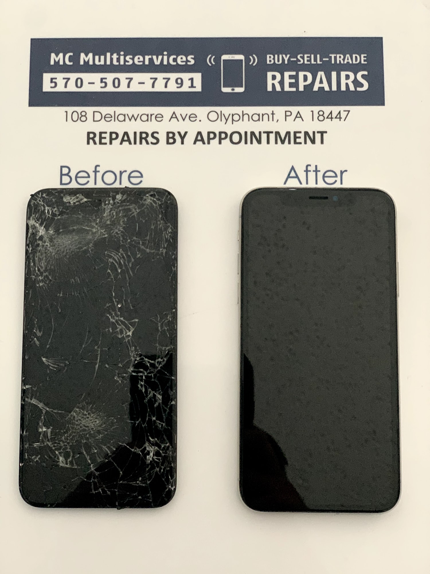 MC Multiservices is BY APPOINTMENT and specializes in Cell Phone and iPad repair services. Home of the 15 minutes or less iPhone Screen Repairs! We REPAIR Electronics including Cell Phones & iPads. Call us at 570-507-7791 to schedule a curbside appointment today!