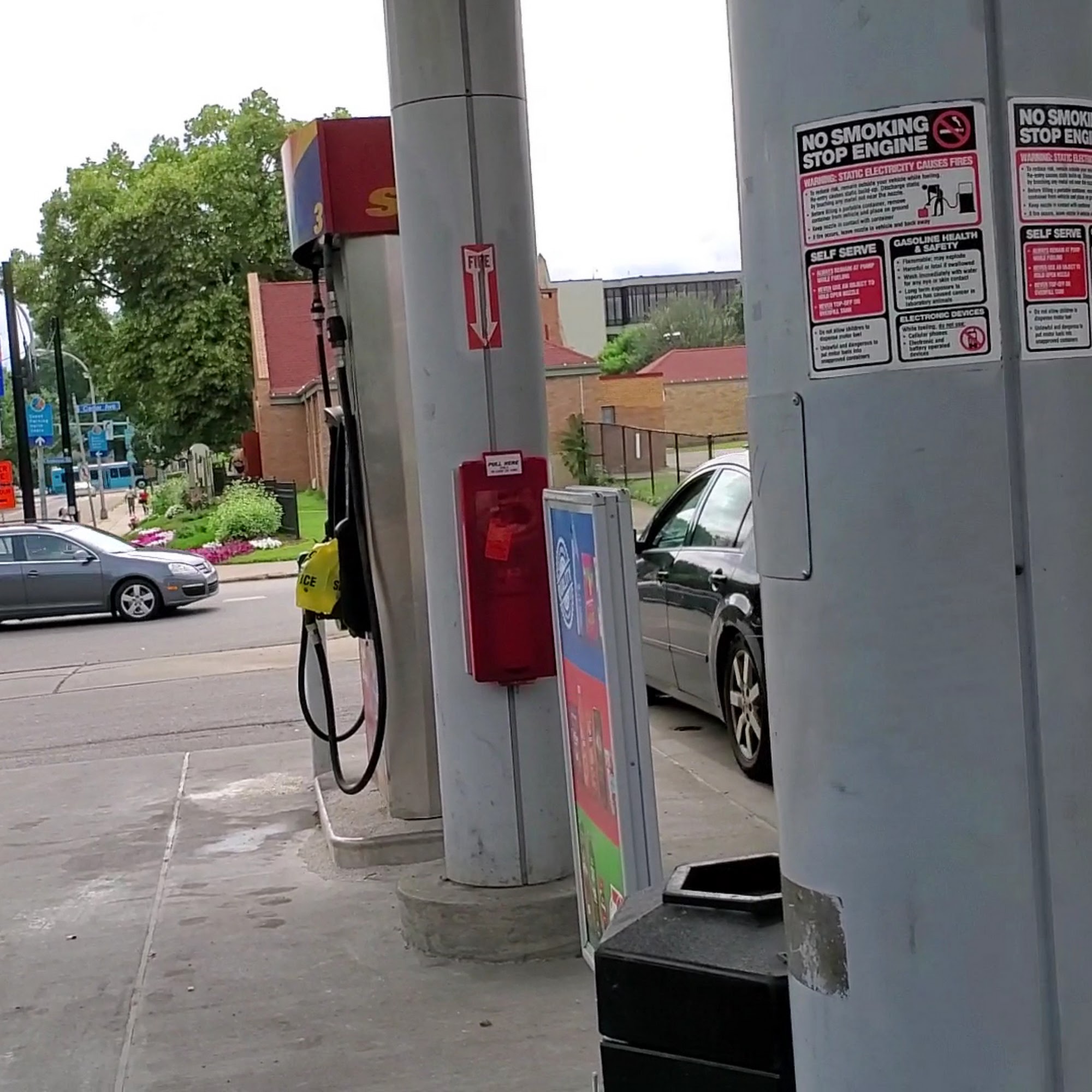 Convenient location. Sketchy people always hanging around. I never pay at pump, always go inside and ask for a receipt! I bought bottle waters, not until I got to my destination noticed I was double charged for waters. Gas prices on billboard and receipt don't always match.