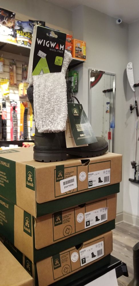 We sell steel toe boots, soft toe boots, clothing, sunglasses, and sneakers from great brands like Asics, Crocs, Dri Duck, Frogg Togg, Irish Setter, Keen, Kamik, Muck, North Face, Oakley, Timberland PRO, and many more! We also sell all the sporting goods, hunting, and fishing supplies and licenses you need for your outdoor activities!
