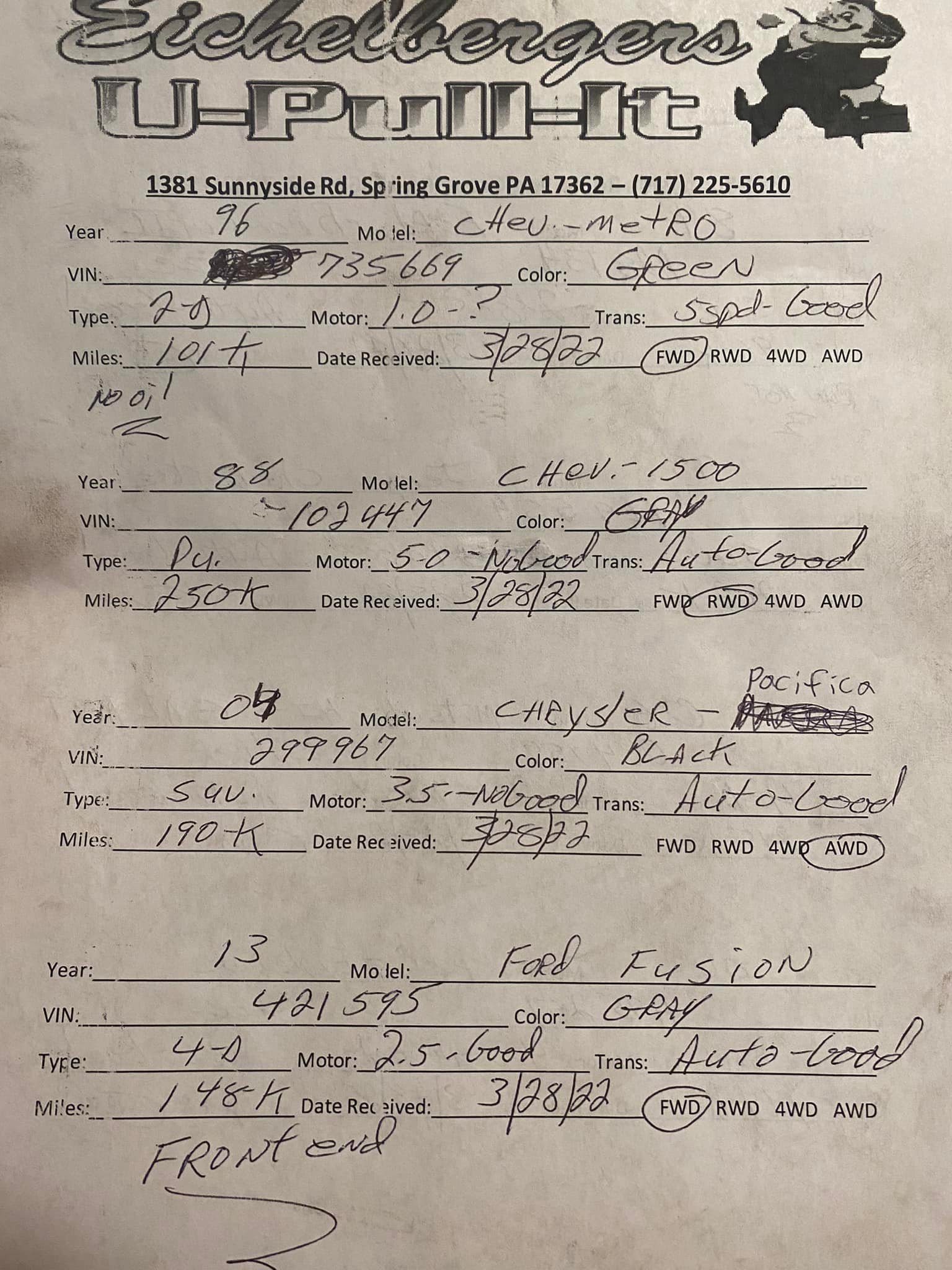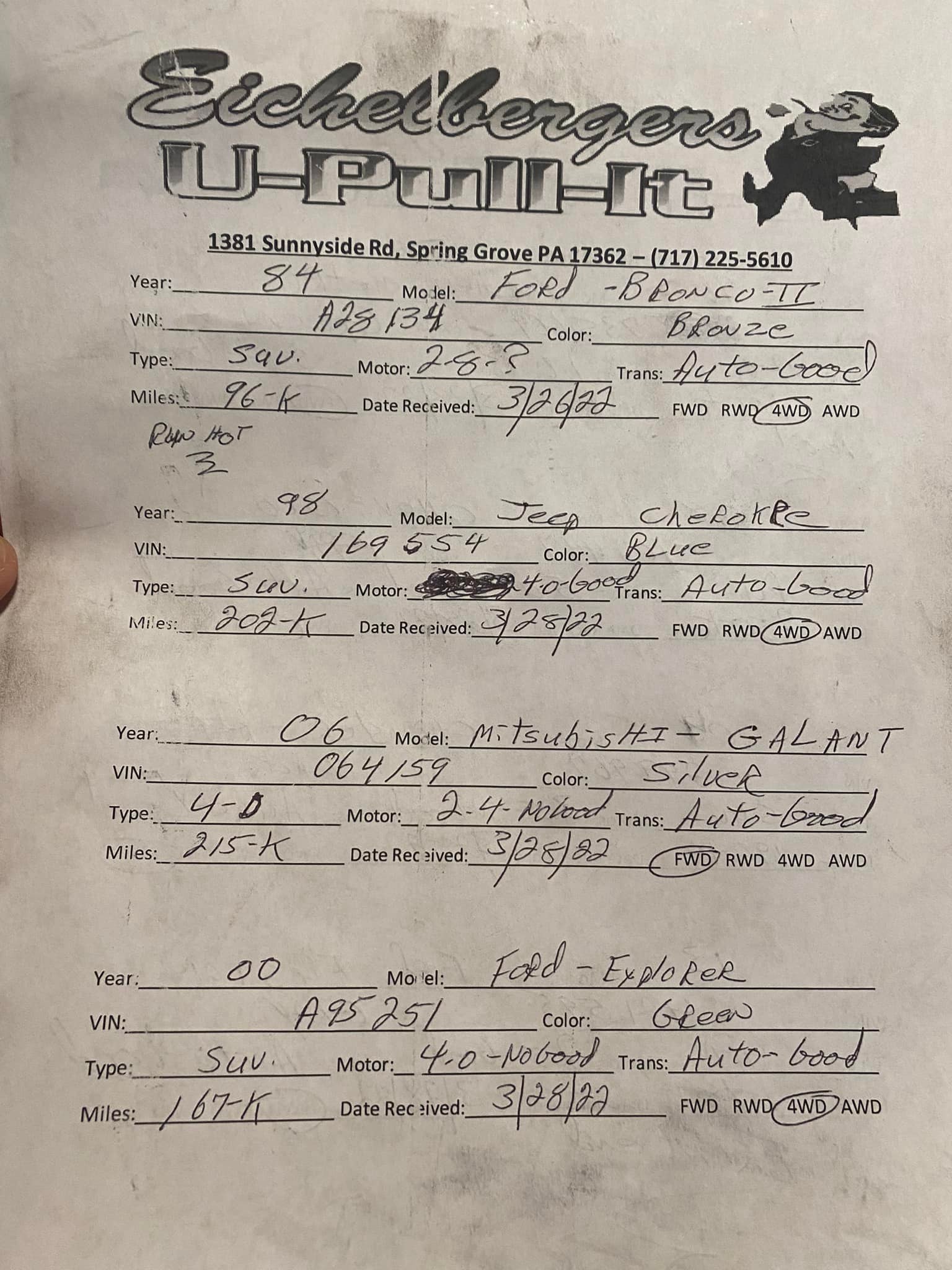 Eichelberger's U Pull It is a large junkyard on a hill with tons of vehicles to look at, offering great prices on used auto parts where customers can save a lot. It is a place for repair enthusiasts to find what they need, from domestic vehicles, though the selection for foreign cars is not specified. Customers are expected to bring their own tools, carry all parts themselves, and can bring a wagon for larger items. The environment is not a clean, catered service but is honest and functional. The guys in the office are easy to talk to, informative, and friendly. Visitors pay a small entry fee, find the part they need from the cars and trucks, and pay the listed price at the office. It is considered the perfect place to get in, get out, and not pay a lot, with many customers returning for years.