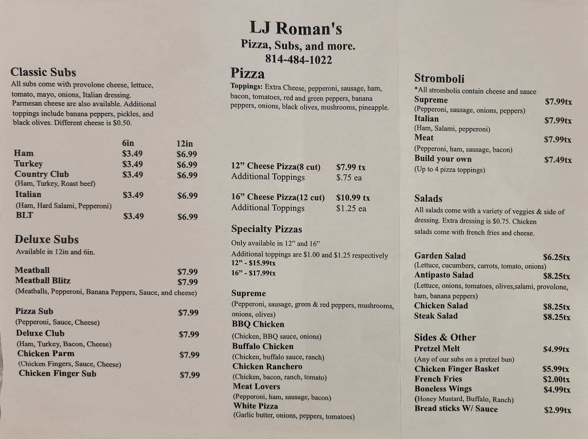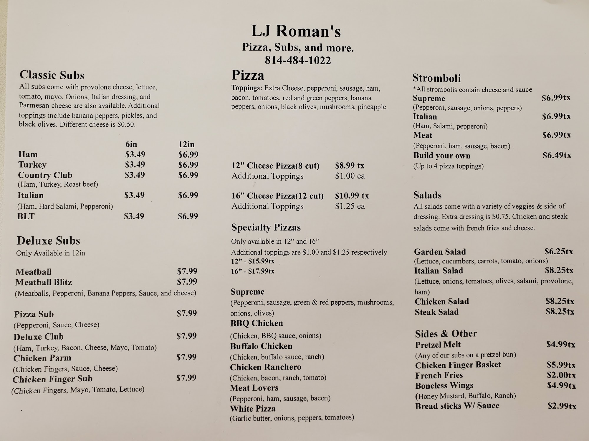 LJ Roman's is a pizza joint and deli known for its great food and great prices. The menu features incredible pizza with fresh, generous toppings and a tasty soft crust, along with excellent items like wings, club sandwiches, and meatball subs. Servings are hearty and generous, cooked to perfection. The staff is very friendly and aims to satisfy customers. The location is wheelchair accessible with ramps at the entrance and lots of parking available. It is a kid-friendly spot with delicious pizza that children enjoy.