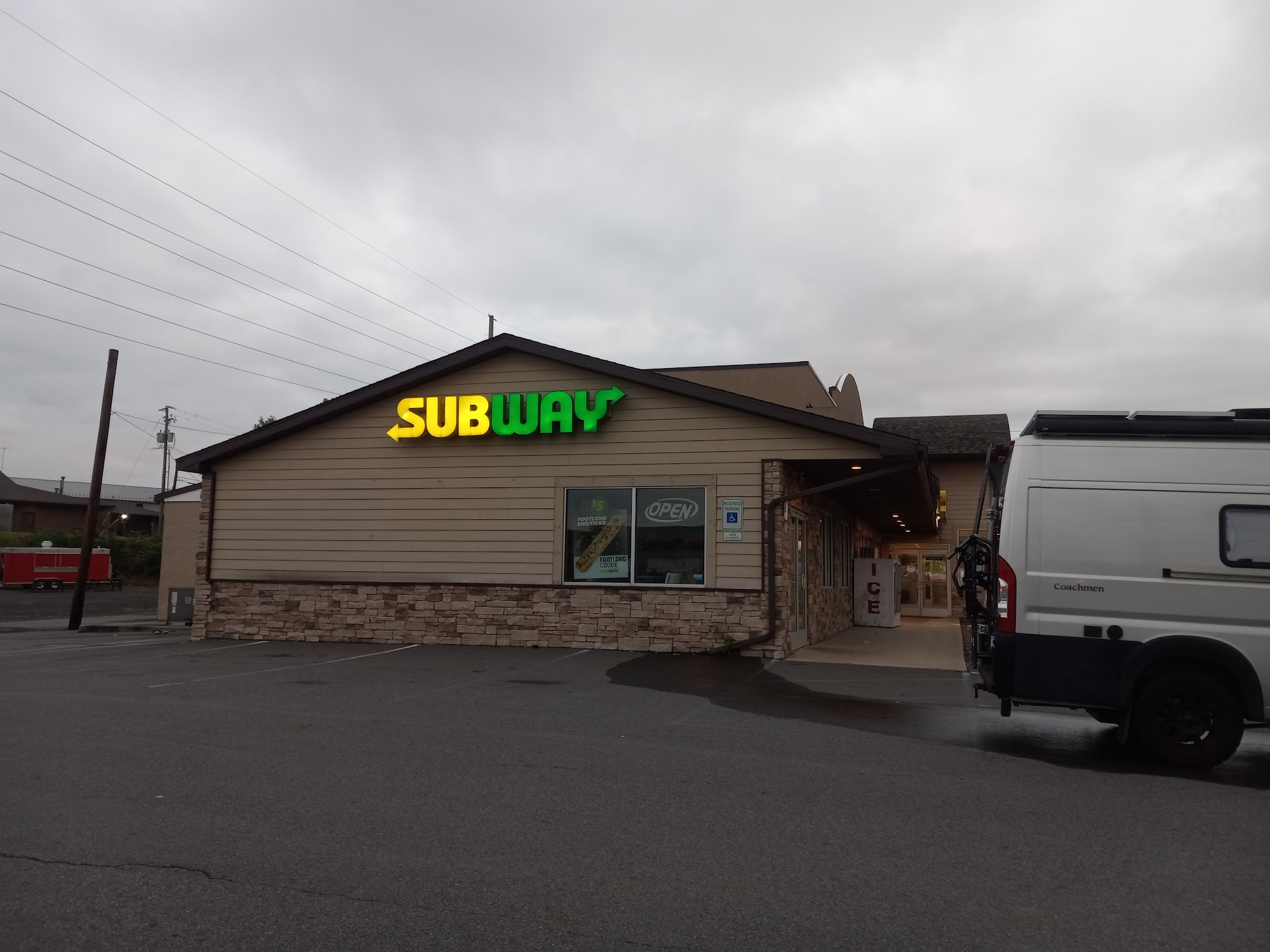Larger gas station property with convenience store and subway. The parking lot was clean, well maintained and well lit. It can accommodate rigs of any size. The store was clean, well maintained and well stocked. I had full bars of Verizon 4G LTE Roaming.