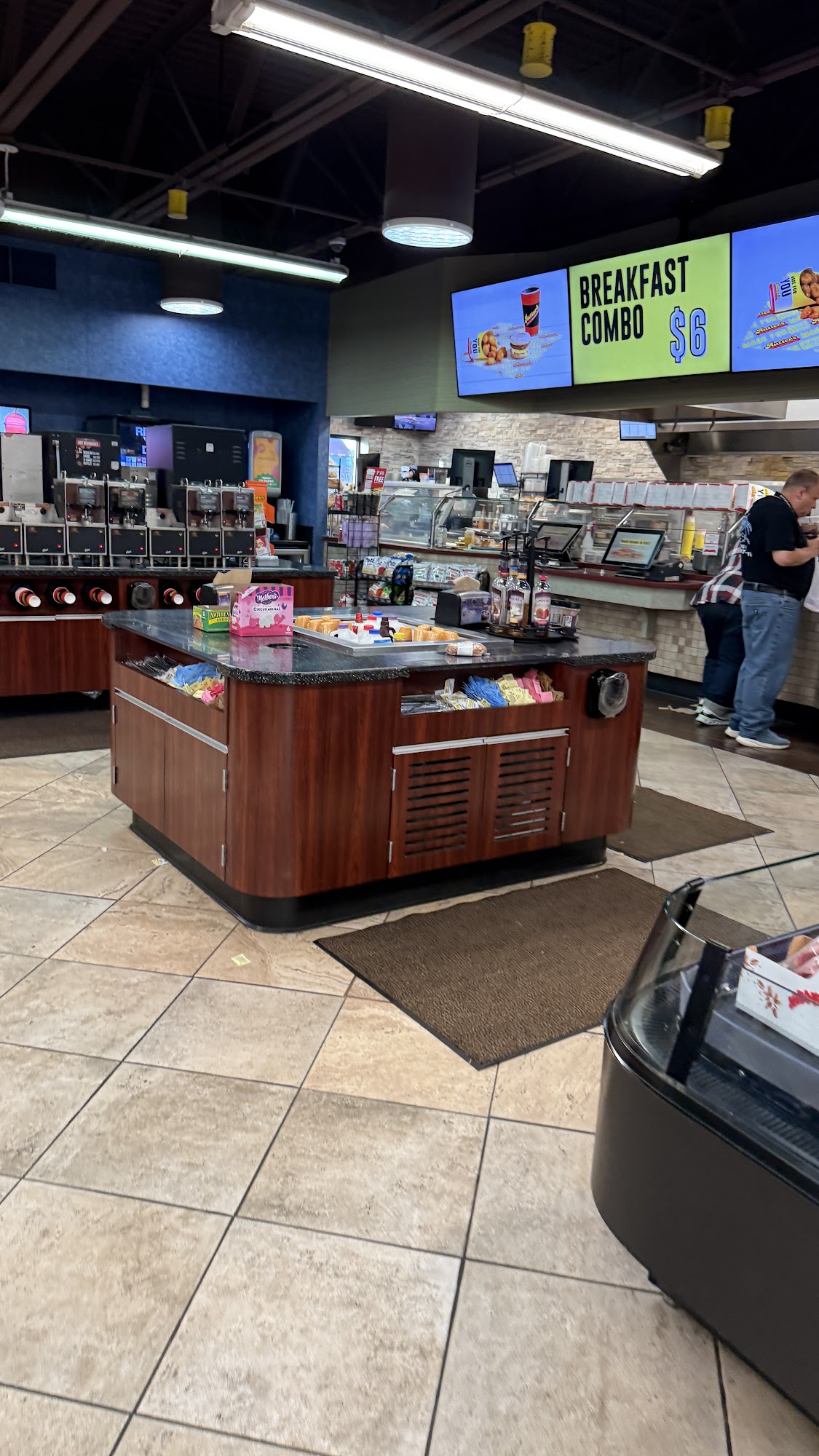 The place is clean and not loud and the employee's seem to be nice they have a small parking lot for big trucks and they have a cafe and the food is good to and a lot of different hot and cold drinks