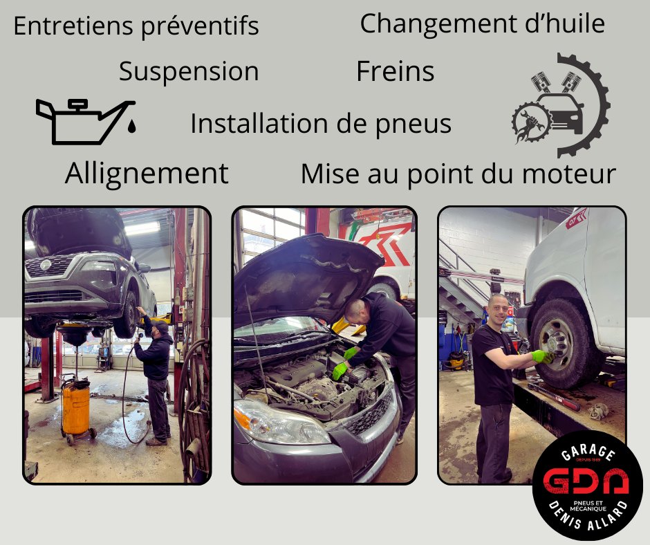 Depuis 1989, le Garage Mécanique Denis Allard est votre garage de confiance pour tous vos besoins en réparation et entretien automobile. Nos mécaniciens certifiés et professionnels sont dévoués à vous fournir un service exceptionnel à chacune de vos visites. Que ce soit pour des réparations mécaniques complexes, un entretien régulier, changement de freins, changement d'huile, réparation de suspension ou diagnostic complet et précis, nous nous engageons à vous offrir un service hors pair ainsi qu'un prix compétitif. Nous accordons une grande importance à votre sécurité et votre satisfaction, c'est pourquoi nous mettons tout en œuvre pour dépasser vos attentes. Chaque étape de notre travail est importante, de l'accueil à l'atelier mécanique.