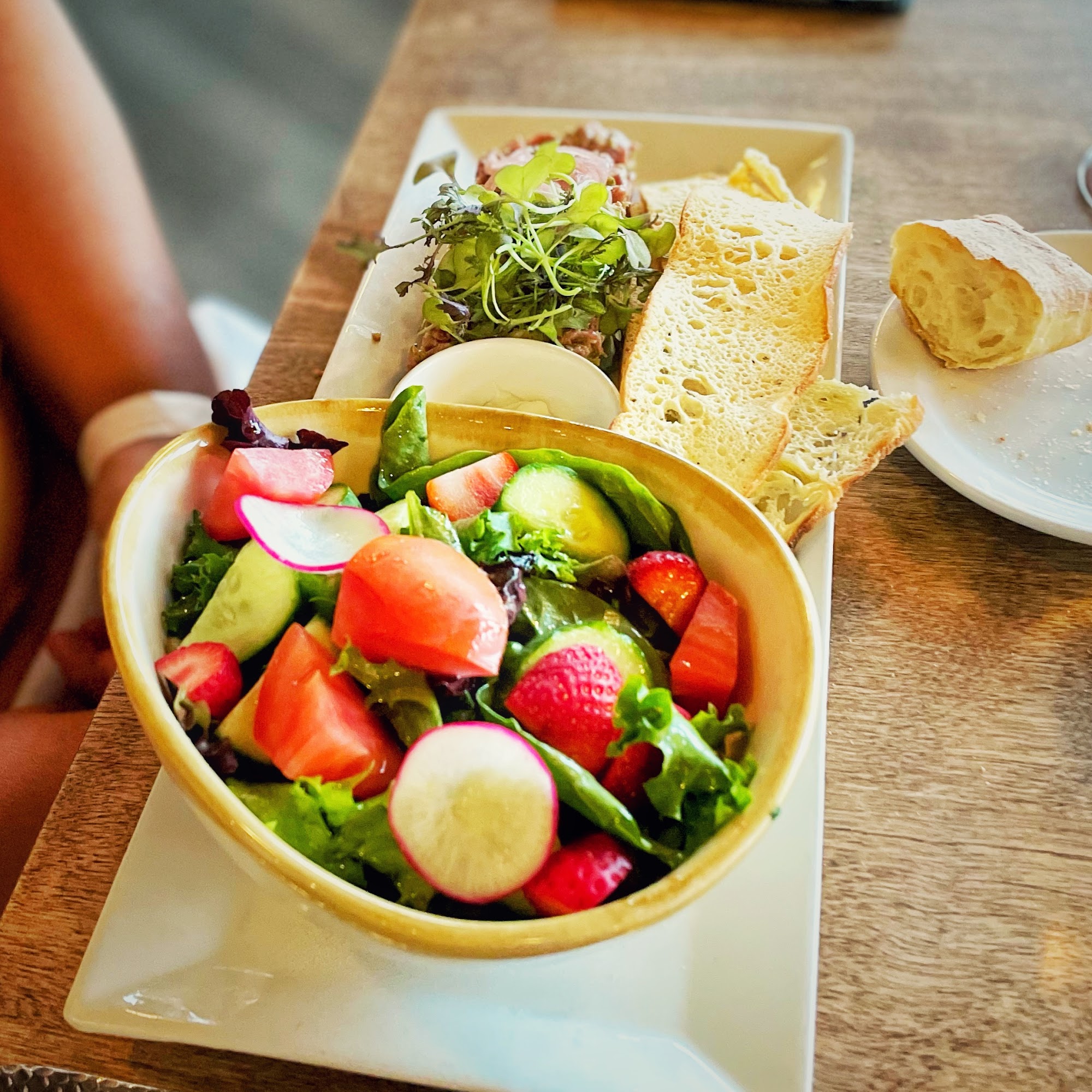 The steak was well made and fresh. Chicken was nice but very little portion. Pasta was tasting great a bit more stiff for my taste but still great. The view was also amazing.