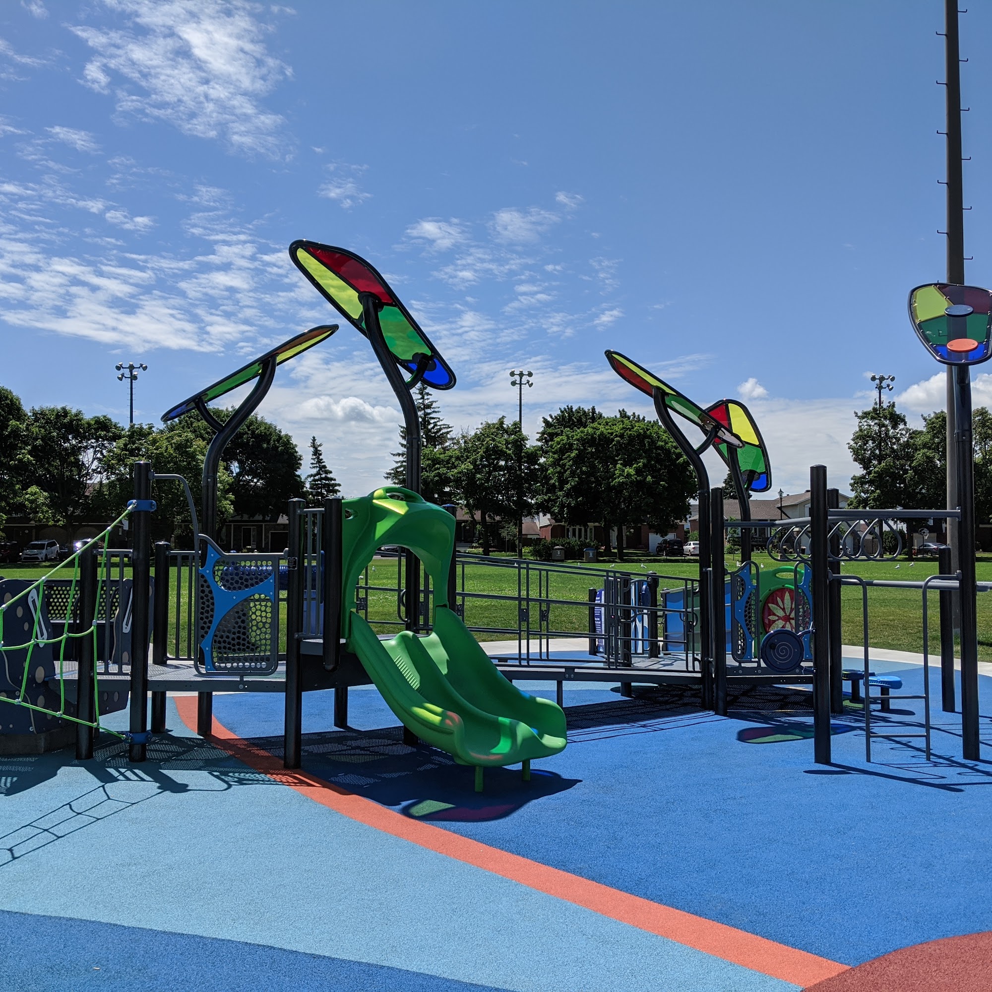 Meades Park is a fun and family-friendly place with soft ground, making it safe for children to play and fall. The park features a variety of play options, including a musical area with drums, climbing spaces, and a built-in trampoline that kids love. It is especially good for children with disabilities, offering accessible playground equipment. There is also a mini water park and splash pad for young kids, providing additional fun. Visitors can enjoy a soccer field, baseball field, and a nearby field for activities like Frisbee or soccer. Picnic tables are available on two sides, though shade is limited, mainly covering one table. The park has ample parking, restrooms inside the nearby arena, and a long bench to test balance skills. Overall, Meades Park offers a safe, enjoyable space for families and kids of all ages.