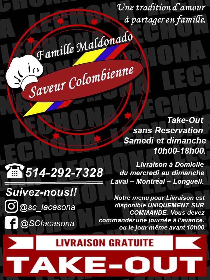 Saveur Colombienne Une tradition d’amour à partager en famille Restaurant - Terrasse - Traiteur Une entreprise familiale établie au Québec depuis 2009. Venez nous visiter et partagez avec nous une expérience inoubliable. Laissez vos papilles vous transporter à travers la Colombie. Notre service traiteur est également disponible avec différents menus thématiques, que ce soit pour un mariage, un anniversaire ou une réunion entre amis. Comptez sur nous pour la réussite de tous vos événements. Saveur Colombienne pour tous vous évènements Corporatif ou privée; Services: Restaurant - Terrasse - Traiteur - Décoration, Gâteaux et plus.